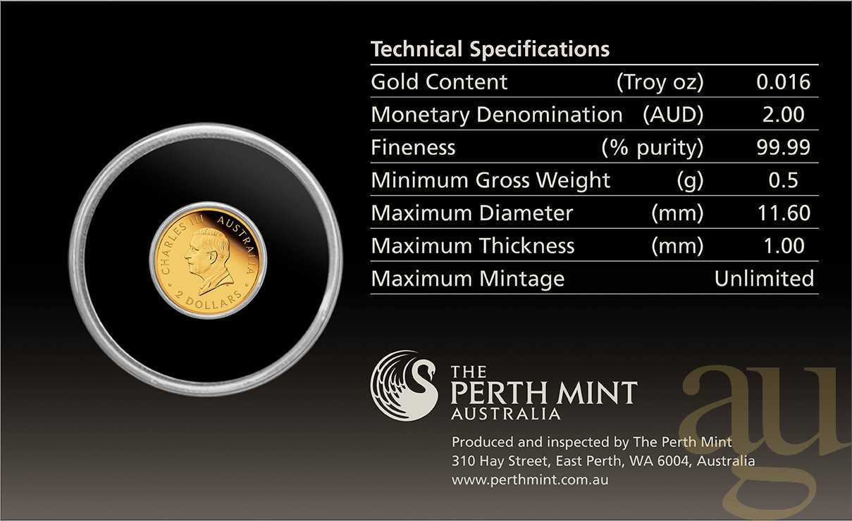 Die Münze zeigt ein miniaturisiertes Abbild eines kauernden Kängurus - das Tier ist durch seinen ikonischen Beutel und seinen hüpfenden Gang zu einem beliebten nationalen Symbol geworden. Das Münzbild enthält auch das Münzzeichen "P" der Perth Mint.