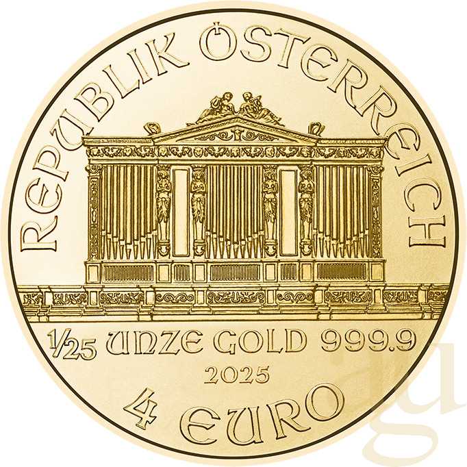 1/25 Unze Goldmünze Wiener Philharmoniker 2024 Die Wiener Philhamoniker in Gold wird im Auftrag der österreichischen Regierung seit dem Jahr 1989 produziert. Sie ist die erfolgreichste europäische Goldmünze und laut „World Gold Council“ sogar in den Jahren 1992, 1995, 1996 und 2000 die am meisten verkaufte Bullion Goldmünze der Welt. Das Aufgeld auf reinen Goldwert ist relativ gering. So ist das Goldstück bei Kapitalanlegern sehr beliebt. Eine Gesetzesänderung ermöglichte 1988 in Österreich die Ausgabe von Goldmünzen. Auf Grund dessen kam man auf die Idee eine Goldmünze zu entwerfen, die für die Musik in Österreich steht. Wer kam da besser in Frage als das weltbekannte Orchester die „Wiener Philharmoniker“? Das Orchester war über diesen Vorschlag nicht sehr begeistert. Erst, Frau Resel, die dem damaligen Orchestervorstand angehörte, konnte durch ihre Begeisterung das Orchester überzeugen. Beschreibung der Goldmünze So entstand ein Motiv, das der heutige Chefgraveur der Münze Österreich, Thomas Pesendorfer, entwarf. Er wählte acht Instrumente aus: Fünf Streichinstrumente die im Vordergrund stehen, dahinter Horn, Fagott und Harfe. Darüber befindet sich der Schriftzug „Wiener Philharmoniker“. Auf der anderen Seite zeigt sie die weltberühmte Orgel aus dem „goldenen“ Saal des Gebäudes des Wiener Musikvereins. Über dem Orgelbild steht halbkreisförmig „Republik Österreich“ und unter der Orgelbalustrade 1/25 Unze, das Feingewicht „Gold 999,9“, darunter das Prägejahr. Am unteren Münzrand ist der jeweilige Nennwert angegeben. Der Münzrand ist gerippt. Der Nennwert wurde von 1989 bis 2001 in „Schilling“ angegeben. Seit 2002 ist der Euro die offizielle österreichische Währung, so entspricht der Nominalwert der Münze, der Währung des Euros. Das führte 2001 dazu, dass diese besonders begehrt sind, da ab 2002 keine Münze mehr mit Schilling-Angabe verkauft werden durften und eingeschmolzen wurden. Wie auch bei den meisten anderen Goldanlagemünzen, ist der Wiener Philharmoniker in den Größen 1/1oz, 1/2oz, 1/4oz, 1/10oz und 1/25oz erhältlich.