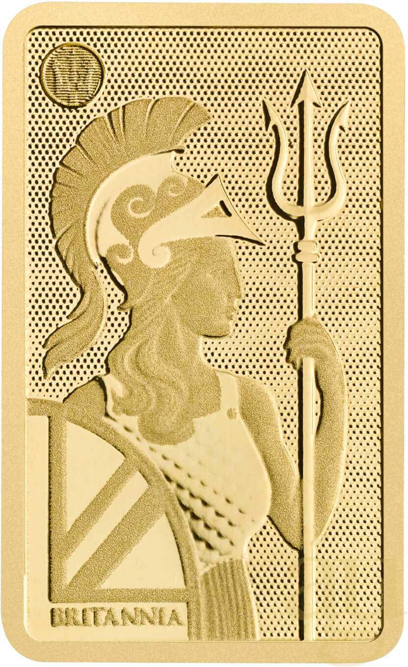 Jody Clarks moderne Darstellung der Britannia ziert die Vorderseite jedes Barrens – inklusive Trident, Union-Jack-Schild und klassischem korinthischen Helm.