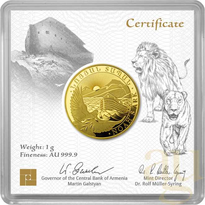 Im September 2020 erschien die Goldmünze Arche Noah aus Armenien erstmals als Anlagemünze in Stempelglanz. Die Geiger Edelmetalle AG besitzt das Prägerecht und produziert die Münze in Deutschland. Auf der Vorderseite ist das aus der Bibel bekannte Schiff in aufgewühlter See vor im Hintergrund verlaufenden Sonnenstrahlen über dem armenischen Gebirge Ararat zu sehen.