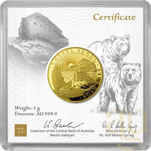 Im September 2020 erschien die Goldmünze Arche Noah aus Armenien erstmals als Anlagemünze in Stempelglanz. Die Geiger Edelmetalle AG besitzt das Prägerecht und produziert die Münze in Deutschland. Auf der Vorderseite ist das aus der Bibel bekannte Schiff in aufgewühlter See vor im Hintergrund verlaufenden Sonnenstrahlen über dem armenischen Gebirge Ararat zu sehen.