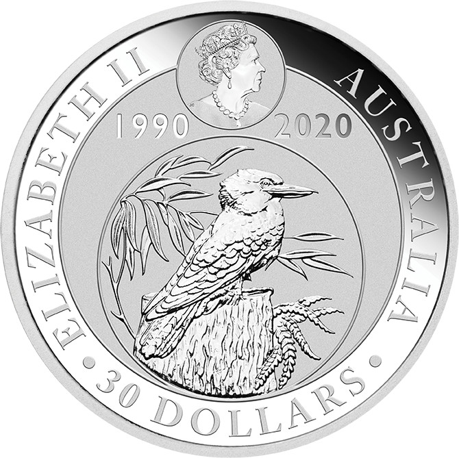 Zum 30. Geburtstag der Silbermünze Kookaburra bringt die Perth Mint eine Münze mit Jubiläumsmotiv heraus. Die Vorderseite ziert die Erstausgabe von 1990 sowie ein Miniatur-Portrait von Queen Elisabeth ll. Die Rückseite glänzt mit der Abbildung des Kookaburra. Die stark unterschiedlichen Auflagen machen diese besondere Silbermünze gleichermaßen für Anleger und Sammler