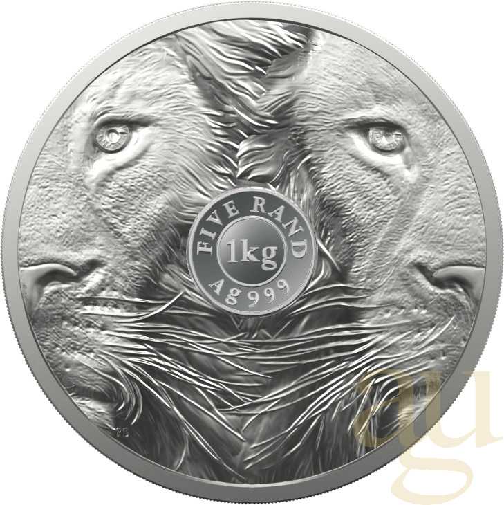 Die Werseite bildet zwei aufmerksame Löwen ab, deren bedrohliche Blicke direkt in die Augen des Betrachters zielen. Die Angaben "FIVE RAND", "1 kg" und "999 Ag" geben Auskunft über den Nennwert, die Stückelung und die Reinheit der Münze.