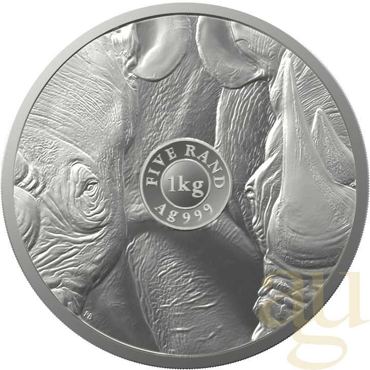 Die Werseite bildet zwei nebeneinanderstehende Nashörner ab. Das linke Nashorn blickt bedrohlich direkt in die Augen des Betrachters, während das rechte Stolz sein charakteristisches Horn präsentiert. Die Angaben "FIVE RAND", "1 kg" und "999 Ag" geben Auskunft über den Nennwert, die Stückelung und die Reinheit der Münze.