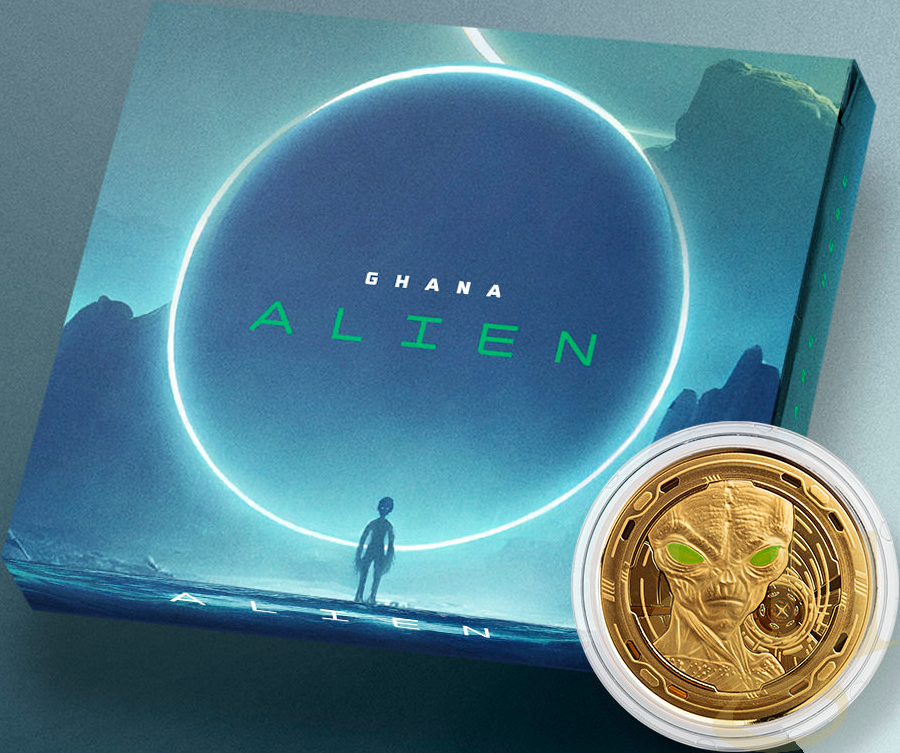 Tauchen Sie ein in die mysteriöse Welt der Außerirdischen mit der exklusiven 1 Unze Goldmünze Africa Ghana Alien 2023 - Coloriert.