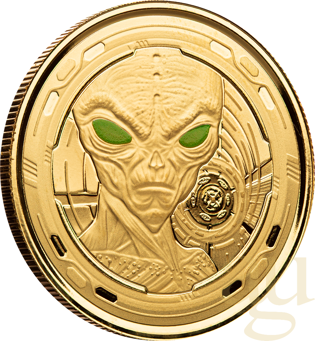 Auf der Motivseite der Münze starren uns zwei mysteriöse Alien direkt an, während die umgebende Gestaltung an eine Raumkapsel erinnert, die das Wesen in einem mystischen Raumgefüge einfängt. Im Hintergrund des Geschehens ist ein intergalaktisches Raumschiff zu vernehmen, welches an einem außerirdischen Planeten vorbeifliegt. Dieses fesselnde Motiv zieht den Betrachter sofort in seinen Bann und regt die Fantasie zu unendlichen Spekulationen an. Aufgrund der speziellen Colorierung der Alienaugen, deren grüne Farbe fluoreszierend ist und somit in dunklen Umgebungen leuchtet, wirken diese noch bedrohlicher.