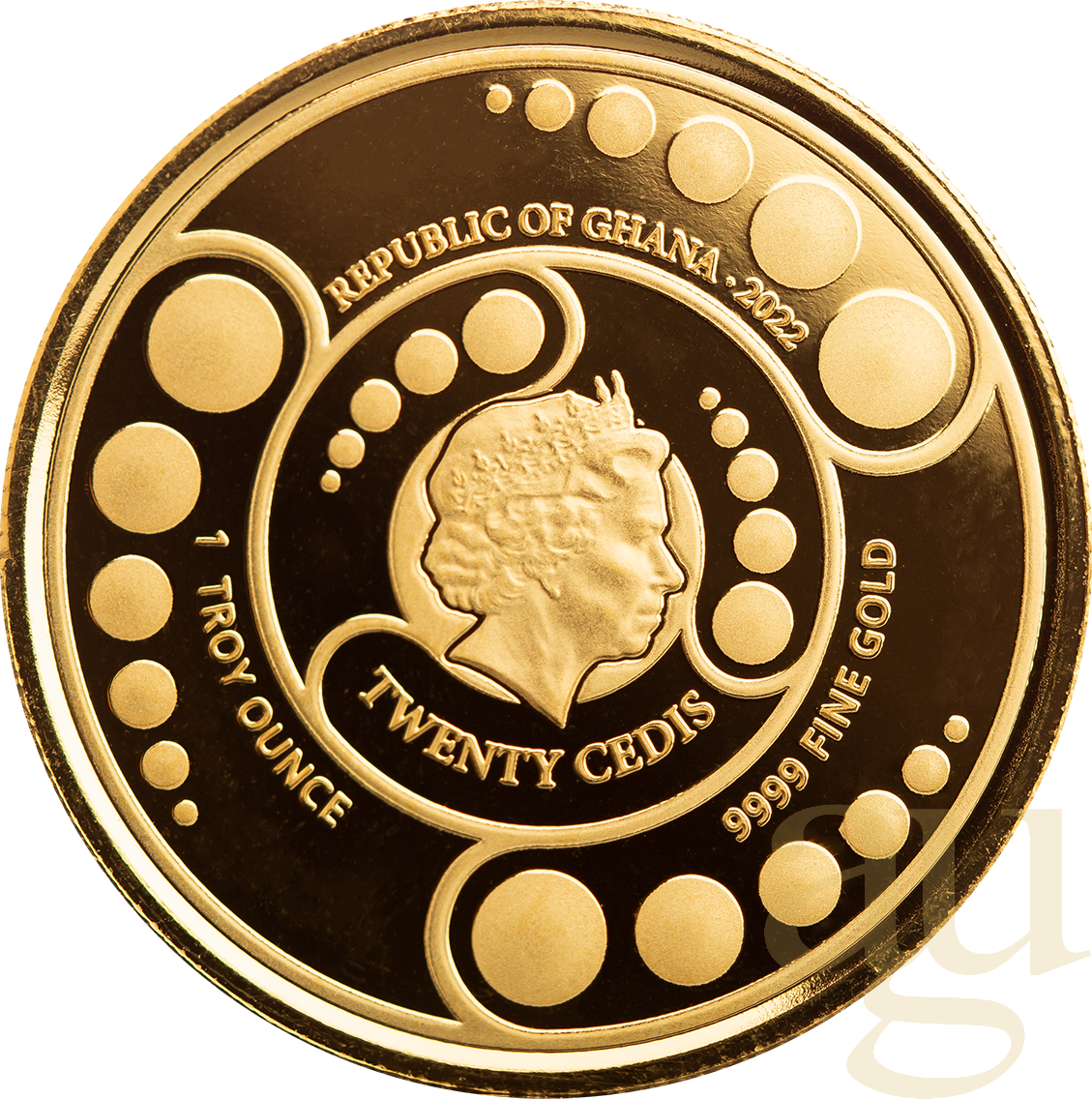 Die Rückseite dieser wertvollen Münze präsentiert eine spiralförmige Anordnung aus Kornkreisen, die eine Verbindung zu fernen Galaxien und geheimnisvollen Dimensionen zu suggerieren scheint. In der Mitte befindet sich das Staatswappen von Ghana mit seinen zwei majestätischen Adlern, was einen faszinierenden Kontrast zu den außerirdischen Motiven bildet.