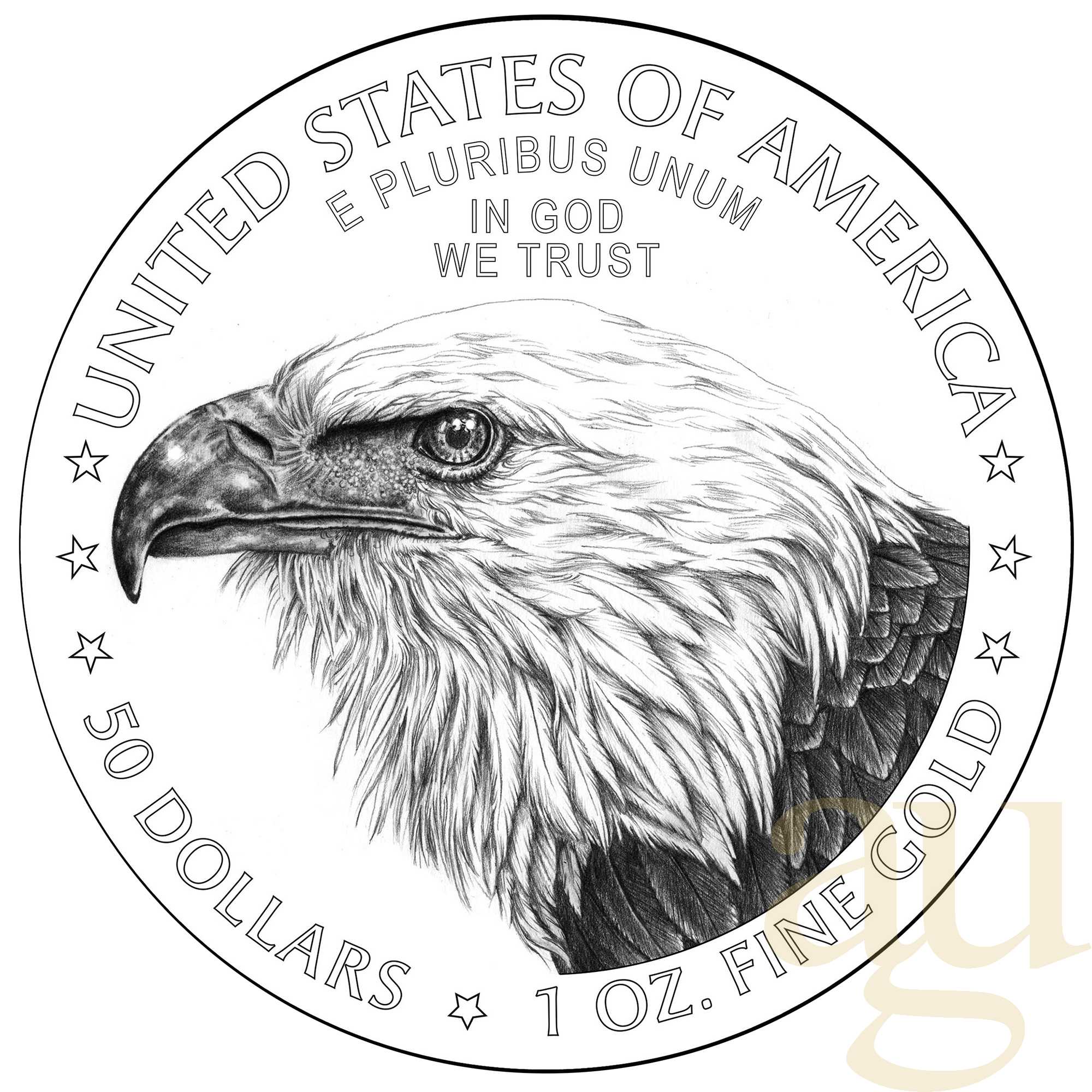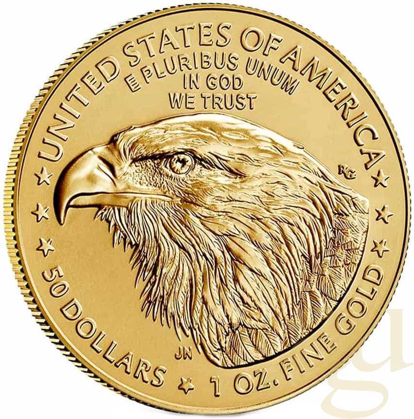 Die Rückseite des Gold Eagle zeigt das neue Rückseitendesign, das von der Designerin Jennie Norris im Rahmen des Artistic Infusion Program (AIP) entworfen und von der Medailleurin Renata Gordon gestaltet wurde. Das Porträt eines Weißkopfseeadlers aus nächster Nähe strahlt eine edle Intensität aus, die ein Gefühl des Stolzes hervorruft.