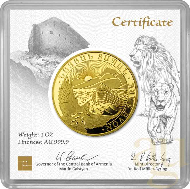 Im September 2020 erschien die Goldmünze Arche Noah aus Armenien erstmals als Anlagemünze in Stempelglanz. Die Geiger Edelmetalle AG besitzt das Prägerecht und produziert die Münze in Deutschland. Auf der Vorderseite ist das aus der Bibel bekannte Schiff in aufgewühlter See vor im Hintergrund verlaufenden Sonnenstrahlen über dem armenischen Gebirge Ararat zu sehen.