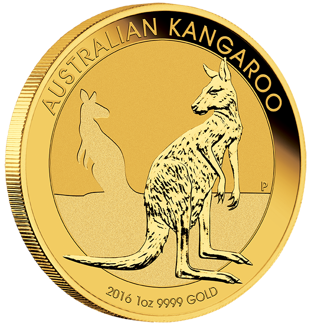Das „Gold-Kangaroo 2016“ präsentiert auf der Vorderseite ein sich ausruhendes Kangaroo in hockender Position ,so wie im Hindergrund zu erkennen, die Silhouette eines weiteren Kangaroos. Das Motiv wird ergänzt durch die Umschrift „AUSTRALIEN KANGAROO“, die Jahreszahl „2016“, das Münzgewicht und dem Feinheitsgrad in Höhe von 9999. Zusätzlich trägt es rechts das traditionelle Münzzeichen „P“ für die Perth Mint. Auf der Wertseite befindet sich Ian Rank-Broadleys Bildnis Queen Elizabeth II. gemeinsam mit Broadleys Initialen „IRB“. Die umlaufende Schrift besteht aus der Beschriftung „ELISABETH II.“ ,dem Land „AUSTRALIAN“ , sowie dem gesetzlichen Nennwert. Die „Gold-Kangaroo“ Anlagemünze oder zu deutsch: Känguru, stammt aus der traditionsreichen Perth Mint, alleiniger Hersteller aller Gold- und Silber- Anlagemünzen, die offiziell von der Regierung Australiens in Auftrag gegeben werden. Erstmals prägte 1986 die Perth Mint den „Australien-Nugget“. Das Motiv des ersten Jahrgangs wurde mit dem berühmten „Welcome-Strainger-Nugget“ (Willkommener Fremdling) geprägt. Die weiteren bis 1990 geprägten Münzen mit außergewöhnlichen, in Australien gefundenen, Naturgoldnuggets. Nach vier Jahren des Nugget-Motivs, wurde es 1990 durch die Beibehaltung des Namens, mit dem Nationalsymbol Australiens, dem „Känguru“ ersetzt. Im Gegensatz zu den Goldnuggets, die nicht sehr ansprechend für Anleger waren, stieg der Absatz durch das Tiermotiv „Kangaroo“ rapide an. So prägte die Perth Mint das Känguru in jährlich wechselden Darstellungen. Im Jahr 2008 änderte man den Namen des Känguru-Nugget zum passenderen „Australian-Kangaroo“. Aktuell wird wird das goldene Känguru in folgenden Größen geprägt: 1kg, 1oz, 1/2oz, 1/4oz, 1/10oz.
