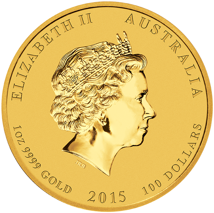 Die Jahreszahl und das Münzgewicht befinden sich nicht mehr auf der Bildseite, sondern auf der Kopfseite unterhalb des Portraits von Queen Elisabeth II., nach dem Entwurf von Ian Rank-Broadley. Dessen Initialen „ IRB“ befinden sich am Halsende des Porträts. Darunter stehen die Angaben zu Prägejahr „ 2015“, zu Feingewicht „1OZ“ und Feinheit „9999“ sowie zum Metall „GOLD“. Zu dem ist auf der Münzvorderseite das Nominal in Australischen „100 DOLLARS“ abgebildet. Umrandet von dem Schriftzug „ELISABETH II“ und „AUSTRALIA“. Der Münzrand ist geriffelt. Auf der Motivseite ist das Bildnis des Tieres zu sehen, welches dem chinesischen Kalender zufolge an der Reihe ist. Jahr der Ziege/Goat 2015: eine Ziege die in einer felsigen Landschaft steht. Der Hintergrund ist eher angedeutet. Die Motive auf der Rückseite werden von Keith Chan entworfen. Unterhalb des Motivs befindet sich die Inschrift "Year of the Goat", die durch jeweils das abgebildete Tier ergänzt wird. Vervollständigt wird die Rückseite der Münze durch das chinesische Schriftzeichen des Tieres. Umschlossen werden Motiv und Schriftzug von einem geschwungenen Zierkreis.