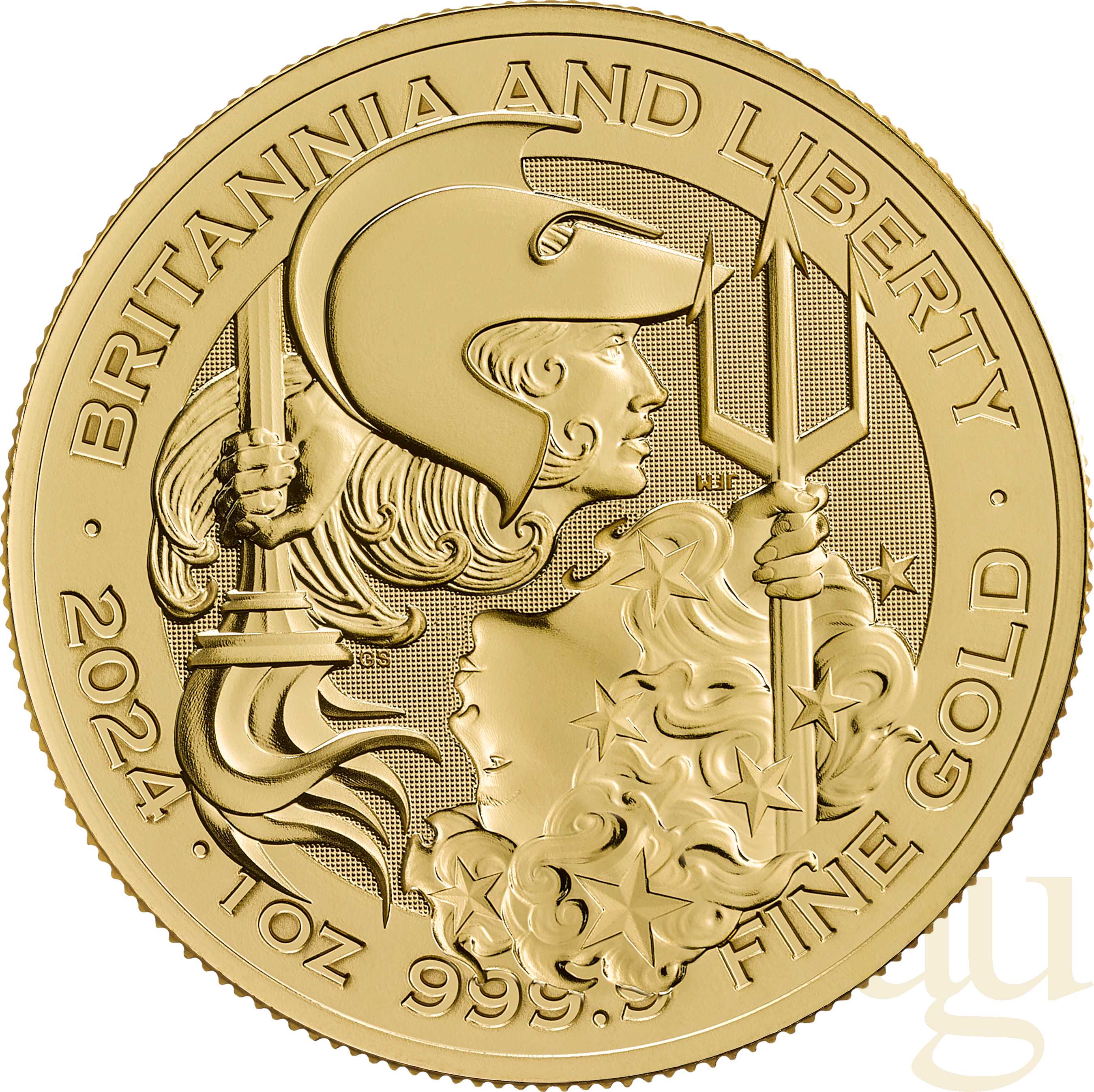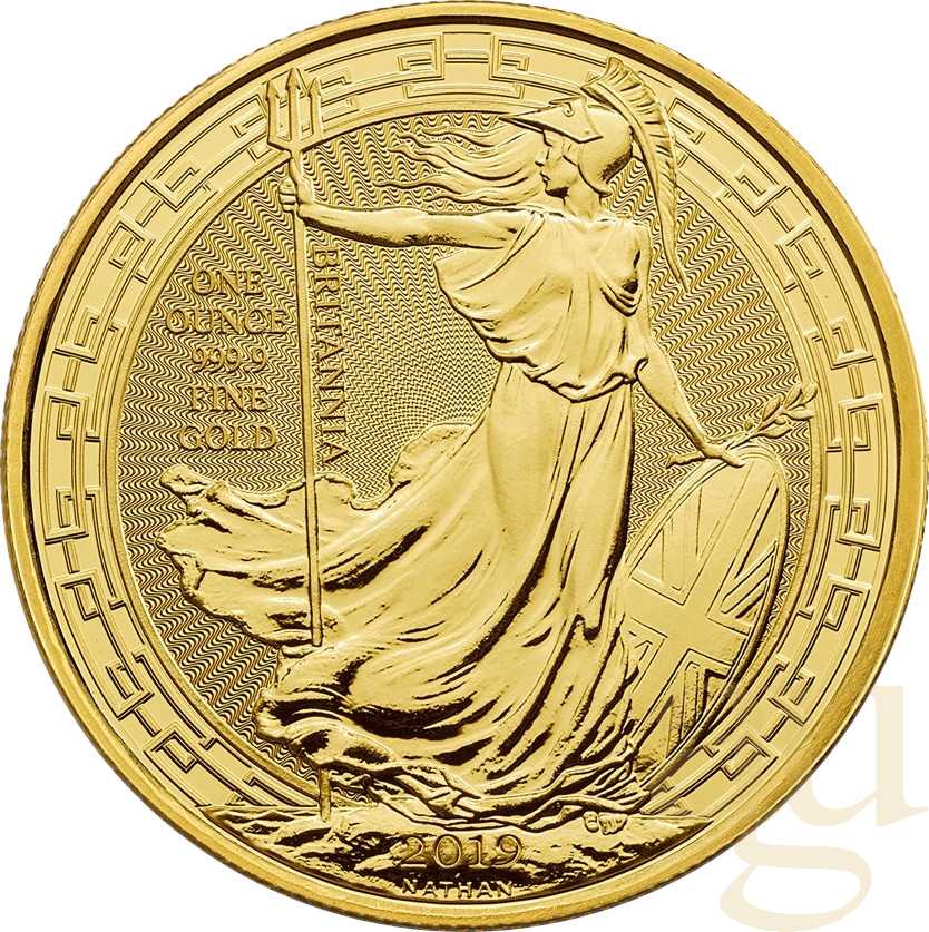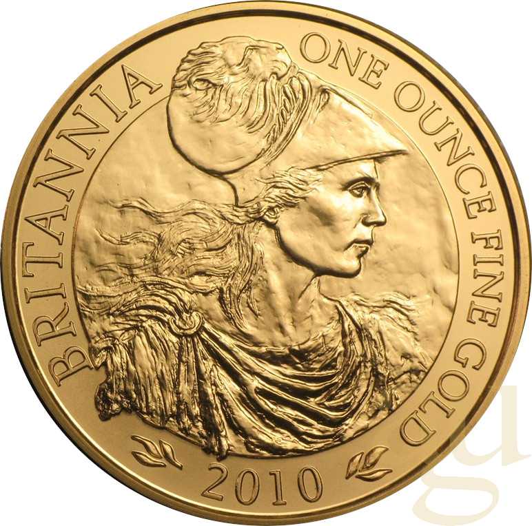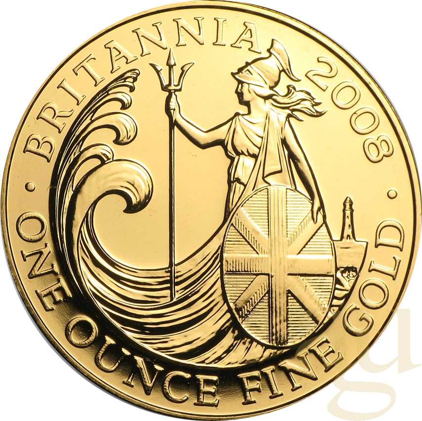 Zu den bekanntesten Münzen aus Großbritannien zählt die Gold Britannia. Sie wird seit 1987 von der Prägeanstalt British Royal Mint geprägt. Die Gold Britannia ist somit eine der ersten europäischen Goldanlagemünze der Neuzeit. Das Motiv blieb in den Jahren 1987 – 1996 unverändert. Auf der Motivseite sieht man das Bild der aufrecht stehenden „Britannia“ mit Helm und wehendem Gewand. In der rechten Hand hält sie einen langen Dreizack, in der anderen Hand einen kleinen Ölzweig, und stützt sich auf ein rundes Schild, das über die ganze Oberfläche den Union Jack (offiziell Union Flag) zeigt. Dort steht rechts die Gewichtsangabe „1 Ounze Fine Gold" und links „Britannia" und das Prägejahr. Ein weiterer Zierkreis am Münzrand schließt das Schriftband ab. Das Design der stehenden „Britannia" stammt von P. Nathan. Auf den Proof-Münzen ist sein Name in kleiner Schrift eingeprägt. Die Nominalseite zeigt das Porträt von Königin Elisabeth II, ein Entwurf von David Maklouf. Um das Porträt ist ein Schriftzug mit den Worten „Elisabeth II Dei Gratia Regina F D" gestaltet. Die Worte „Dei Gratia Regina" bedeuten: „Königin von Gottes Gnaden". Die Buchstaben „F D" stehen für „fidei defensor", was übersetzt „Verteidigerin des Glaubens" bedeutet. Unter dem Bild ist der jeweilige Nominalwert angegeben. Der Schriftzug wird zum Münzrand hin durch einen Zierkranz mit eckigen Zacken eingegrenzt. 1998 wurde das Design dieser Münzseite durch Ian Rank-Broadley überarbeitet und dabei das Portrait der Königin altersgemäß leicht angepasst und die Worte „Dei Gratia Regina" durch die Abkürzung „D G Reg" ersetzt. Diese Gestaltung der Erstausgabe blieb 10 Jahre unverändert. Auf den Münzjahrgängen zum 10-jährigen Jubiläum, und wohl auch aus Marketinggründen, erschien 1997 die erste Gold-Britannia mit einem anderen Motiv. Damit wurde eine Entwicklung zum Jahre 2001 eingeleitet, die in den geraden Jahren weiterhin das bekannte stehende Britannia-Motiv zeigt, während in den ungeraden Jahren Münzen mit wechselnden Motiven der Britannia geprägt werden. Die Münze hat seit 2013 einen Feingehalt von 999,9 Tausendstel. Bis 2012 hatte die Britannia einen Feingehalt von 916,66, was 22 Karat entspricht. Bis 1989 wurde als Legierung Kupfer mit einem Anteil von einem Zwölftel eingesetzt. Danach wurde Silber und Kupfer in gleichem Verhältnis zueinander eingesetzt. Dieses hatte zur Folge, dass der Farbton der Münze von Rot nach Gelb wechselte. Außerdem ist die Größe der Münze gegenüber den Prägungen bis 2012 größer und flacher.
