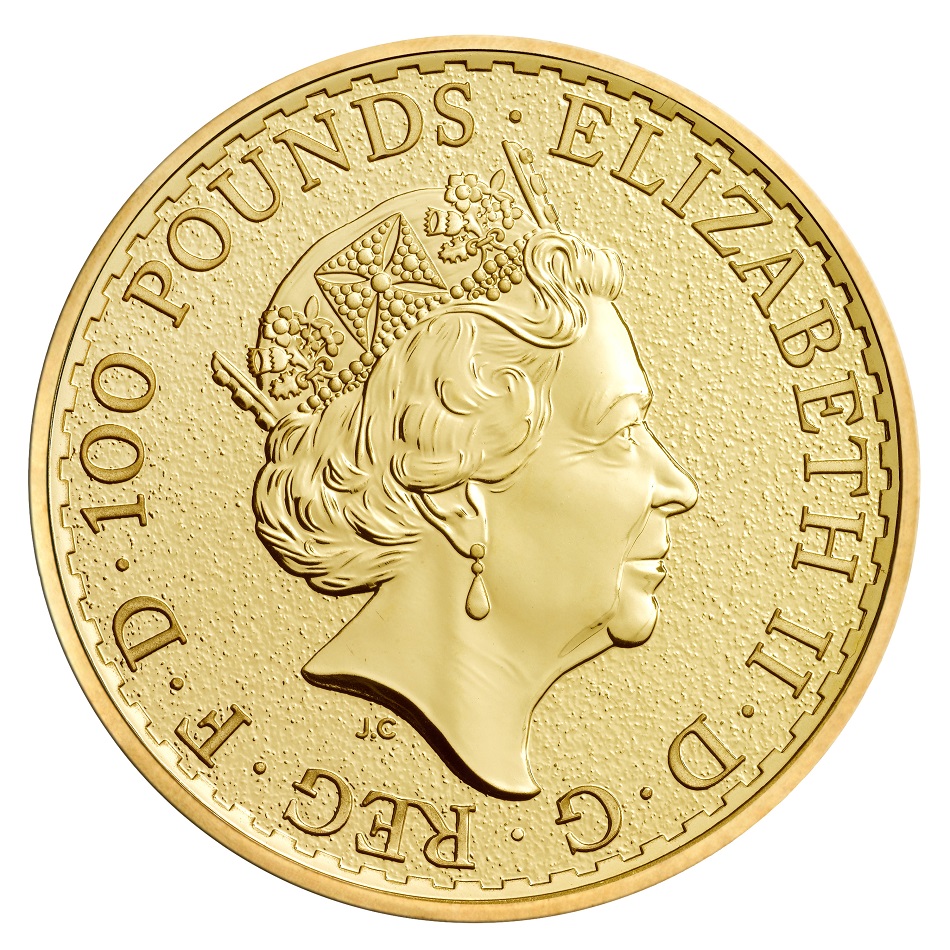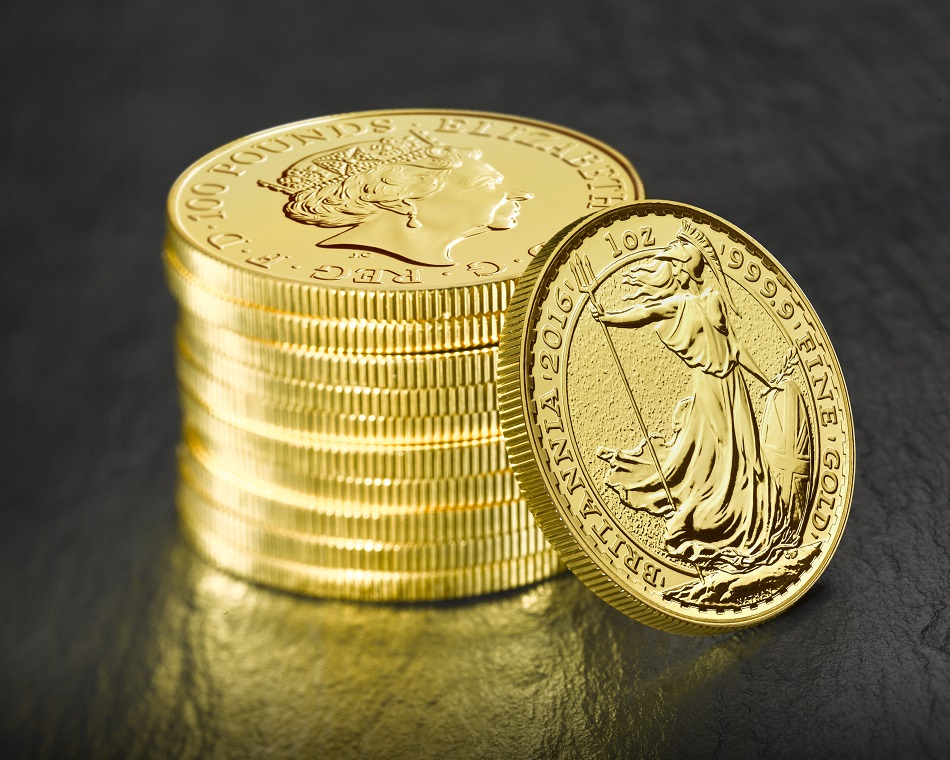 Zu den bekanntesten Münzen aus Großbritannien zählt die Gold Britannia. Sie wird seit 1987 von der Prägeanstalt British Royal Mint geprägt. Die Gold Britannia ist somit eine der ersten europäischen Goldanlagemünze der Neuzeit. Das Motiv blieb in den Jahren 1987 – 1996 unverändert. Auf der Motivseite sieht man das Bild der aufrecht stehenden „Britannia“ mit Helm und wehendem Gewand. In der rechten Hand hält sie einen langen Dreizack, in der anderen Hand einen kleinen Ölzweig, und stützt sich auf ein rundes Schild, das über die ganze Oberfläche den Union Jack (offiziell Union Flag) zeigt. Dort steht rechts die Gewichtsangabe „1 Ounze Fine Gold" und links „Britannia" und das Prägejahr. Ein weiterer Zierkreis am Münzrand schließt das Schriftband ab. Das Design der stehenden „Britannia" stammt von P. Nathan. Auf den Proof-Münzen ist sein Name in kleiner Schrift eingeprägt. Die Nominalseite zeigt das Porträt von Königin Elisabeth II, ein Entwurf von David Maklouf. Um das Porträt ist ein Schriftzug mit den Worten „Elisabeth II Dei Gratia Regina F D" gestaltet. Die Worte „Dei Gratia Regina" bedeuten: „Königin von Gottes Gnaden". Die Buchstaben „F D" stehen für „fidei defensor", was übersetzt „Verteidigerin des Glaubens" bedeutet. Unter dem Bild ist der jeweilige Nominalwert angegeben. Der Schriftzug wird zum Münzrand hin durch einen Zierkranz mit eckigen Zacken eingegrenzt. 1998 wurde das Design dieser Münzseite durch Ian Rank-Broadley überarbeitet und dabei das Portrait der Königin altersgemäß leicht angepasst und die Worte „Dei Gratia Regina" durch die Abkürzung „D G Reg" ersetzt. Diese Gestaltung der Erstausgabe blieb 10 Jahre unverändert. Auf den Münzjahrgängen zum 10-jährigen Jubiläum, und wohl auch aus Marketinggründen, erschien 1997 die erste Gold-Britannia mit einem anderen Motiv. Damit wurde eine Entwicklung zum Jahre 2001 eingeleitet, die in den geraden Jahren weiterhin das bekannte stehende Britannia-Motiv zeigt, während in den ungeraden Jahren Münzen mit wechselnden Motiven der Britannia geprägt werden. Die Münze hat seit 2013 einen Feingehalt von 999,9 Tausendstel. Bis 2012 hatte die Britannia einen Feingehalt von 916,66, was 22 Karat entspricht. Bis 1989 wurde als Legierung Kupfer mit einem Anteil von einem Zwölftel eingesetzt. Danach wurde Silber und Kupfer in gleichem Verhältnis zueinander eingesetzt. Dieses hatte zur Folge, dass der Farbton der Münze von Rot nach Gelb wechselte. Außerdem ist die Größe der Münze gegenüber den Prägungen bis 2012 größer und flacher.
