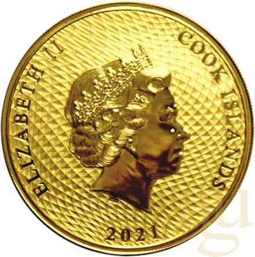 Die Cook Islands Goldmünze stammt von den Cook Island Inselgruppe im Südpazifik. Die 1 Unze Goldmünze wurde erstmals 2009 ausgegeben. Zuvor gab es bereits Silbermünzbarren und eine Silbermünze die das gleiche Motiv trägt wie die 1 Unze Goldmünze. Die Cook Islands aus Gold ist eine Anlagemünze, es handelt sich hierbei um Agenturausgaben die in Deutschland geprägt werden. Die Motivseite der 1 Unze Cook Islands Goldmünze zeigt das berühmte Segelschiff Bounty, den Dreimaster, mit dem Kapitän W. Bligh 1789 auf den südpazifischen Cook Islands landete. Der Dreimaster erlangte durch den Roman „Die Meuterei auf der Bounty“ Bekanntheit, bei der sich Kapitän Bligh und Fletcher Christian bekämpften, was dann darauf hinaus lief, dass Kapitän Bligh mit einigen treuen Anhängern, in einem Rettungsboot auf offener See ausgesetzt wurde. Die Meuterei wurde auch mehrfach verfilmt. Heute noch können die Überreste der Bounty, an ihrer letzten Anlegestelle in Pitcairn besichtigt werden. Allerdings muss man sich dann in ca. fünf Meter tiefes Wasser begeben. Unter dem Motiv der Bounty, wird der Nennwert von 100 Cook Islands Dollars angegeben, darunter sind das Gewicht von 1oz, fein Gold und die Feinheit von 9999 eingeprägt. Auf der Rückseite befindet sich ein Portrait von Queen Elizabeth II., welches von Ian Rank-Broadley gestaltet wurde und in unregelmäßigen Zeitabständen überarbeitet wird, um dem aktuellen Aussehen der Englischen Königin gerecht zu werden. Am Münzrand befinden sich die Angaben zu Ausgabeland "COOK ISLANDS", dem Prägejahr sowie der Name der Queen "ELIZABETH II".