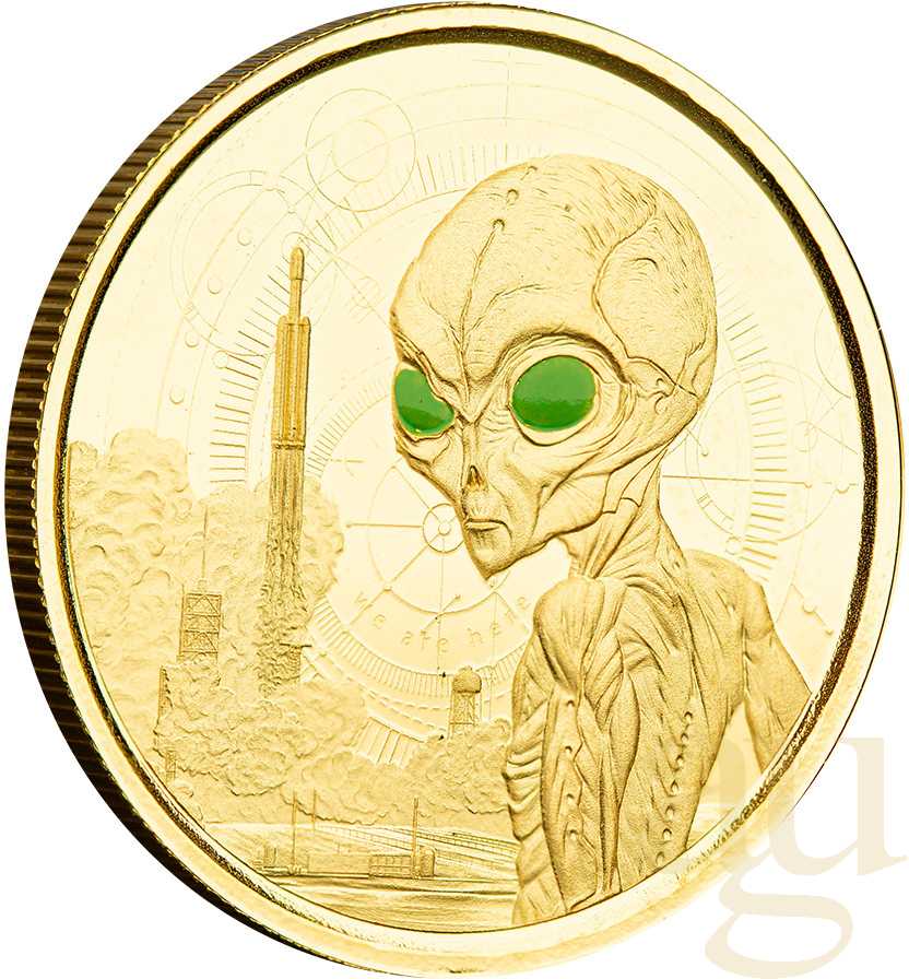 Die Menschen haben sich schon immer für die Idee außerirdischen Lebens interessiert. Von Büchern bis hin zu Filmen, Geschichten und Gerüchte über außerirdische Wesen sind jetzt überall zu finden. Erst kürzlich hat die NASA Aufnahmen von UFOs veröffentlicht, und überall auf der Welt hört man seltsame Geräusche. Was wäre, wenn Kreaturen aus dem Weltraum zu Besuch kämen und Handel treiben wollten? Was würden sie als Währung verwenden? Die erste ihrer Art! Dieser Ghana Alien Coin ist die ultimative Münze für alle, die an Außerirdische glauben, mit einem vom Weltraum inspirierten Design und UV-Tinte, die eine im Dunkeln leuchtende Botschaft enthüllt, die nur "sie" sehen können. Diese einzigartigen Münzen gibt es in FÜNF verschiedenen Ausführungen: Die Goldmünzen werden in einer Sammlerbox und mit einem Zertifikat ausgeliefert. Diese Alien-Münzen sind perfekt für alle UFO-Enthusiasten, Sammler von Weltraummünzen und Science-Fiction-Fans. Die Rückseite der Münze zeigt einen Außerirdischen vor einer von der Erde startenden Rakete und einem futuristischen Design im Hintergrund. Auf der Vorderseite ist das klassische Bildnis von Königin Elizabeth II. von Ian Rank-Broadley umgeben von Kornkreisen abgebildet. Die Serie beleuchtet einen mysteriösen Außerirdischen und seine Mission, neue Technologien auf der Erde zu verbreiten - und so der Menschheit zu helfen, sich als Spezies weiterzuentwickeln. Sind diese Außerirdischen freundlich gesinnt? Oder sind sie hier, um die Menschheit zu erobern? Nur die Zeit wird es zeigen... Auflage weltweit nur 100 Stück!