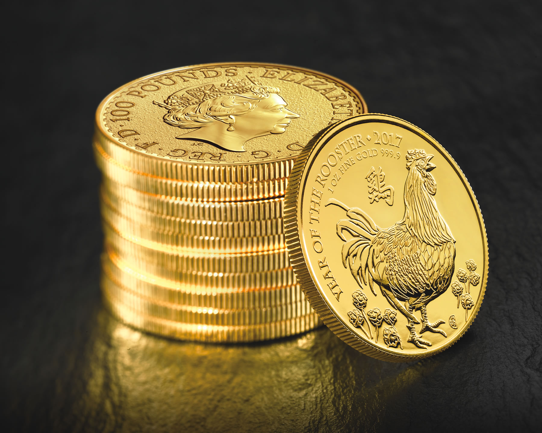 Mit der UK Lunar Goldmünzen Serie, der britischen Royal Mint, begann im Herbst 2013 die erste Lunar Serie aus Großbritannien. Die britische Gold Lunar "Shēngxiào Collection" startete mit dem Motiv des Pferdes. Im Jahr darauf erschien das Schaf (2015), dann der Affe (2016). Der Lunar Hahn 2017 ist die vierte Münze aus England. Im Gegensatz zu den Australiern sind von Beginn an, die alljährlichen Motive des Tierkreiszeichen auf der „Gold“- wie auch auf der „Silberversion“ identisch. Wie alle vorgänger Münzen aus der Lunarserie, wurde auch der UK Hahn 2017 von der britisch-chinesischen Künstlerin Wuon-Gean Ho entworfen. Die Künstlerin hat bereits in der „Tate Gallery“ sowie dem „Victoria and Albert Museum“ ausgestellt. Auf der Vorderseite der Münze sieht man einen krähenden Sumpfhahn der in 10 fein gearbeiteten Sumpfgänseblümchen steht. Die Nummer zehn ist das Symbol der Vollkommenheit gemäß der chinesischen Kultur. Jede Münze zeigt auch die Nummer acht, die das Symbol des Glücks ist. Darüber befindet sich die Umlaufschrift „YEAR OF THE ROOSTER“, die Jahreszahl „2017“, darunter leicht versetzt zur rechten Seite sind die Angaben des Nennwertes „1 OZ FINEGOLD“ und das Feingewichts „999,9“ eingeprägt. Das chinesische Schriftzeichen für das Jahr des Hahns vervollständigen die Motivseite. Auf der Nennwertseite ist das britische Staatsoberhaupt Königin Elisabeth II. abgebildet. Es handelt sich hier um den fünften Entwurf des Bildnis der Queen, das der britische Bildhauer Ian Rank-Broadley schuf. In der Rundschrift befindet sich neben dem Nennwert in britischen Pfund „100 POUNDS“, der Name der Queen „ELISABETH II“, der durch den lateinischen Schriftzug „D.G. REG FID DEF" ("Dei Gratia Regina Fidei Defensor") ergänzt wird, der ins Deutsche übertragen "Durch Gottes Gnade Königin, Verteidigerin des Glaubens" bedeutet. Der Münzrand ist geriffelt.