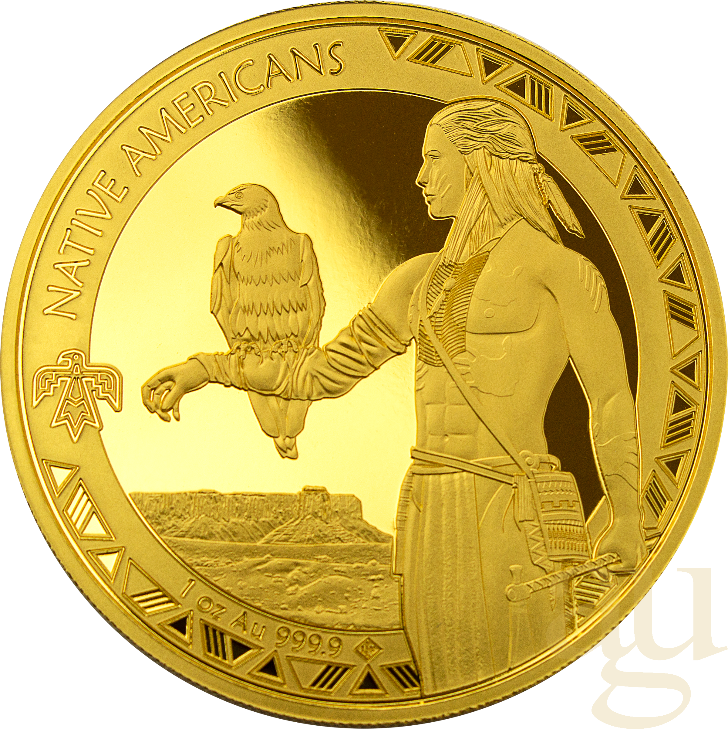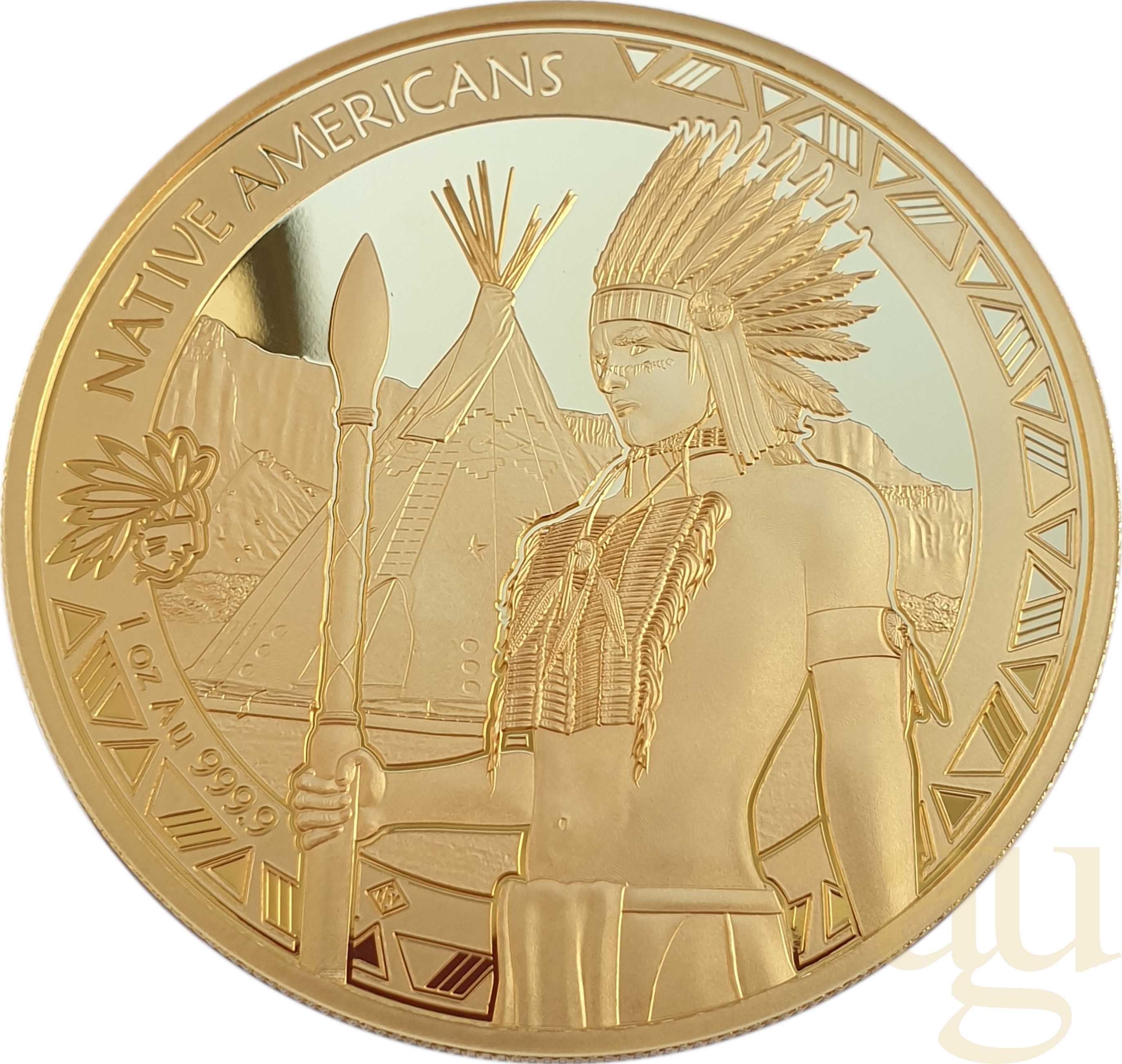 Auf der Motivseite der Goldmünze sehen wir einen amerikanischen Ureinwohner der eine typische Kriegshaube aus Federschmuck (eng. Warbonnet) auf dem Kopf trägt. Umrandet wird das Schaubild von, für die Kultur typischen, Mustern und dem Schriftzug "Native Americans" mit dem Kriegshaubensymbol.