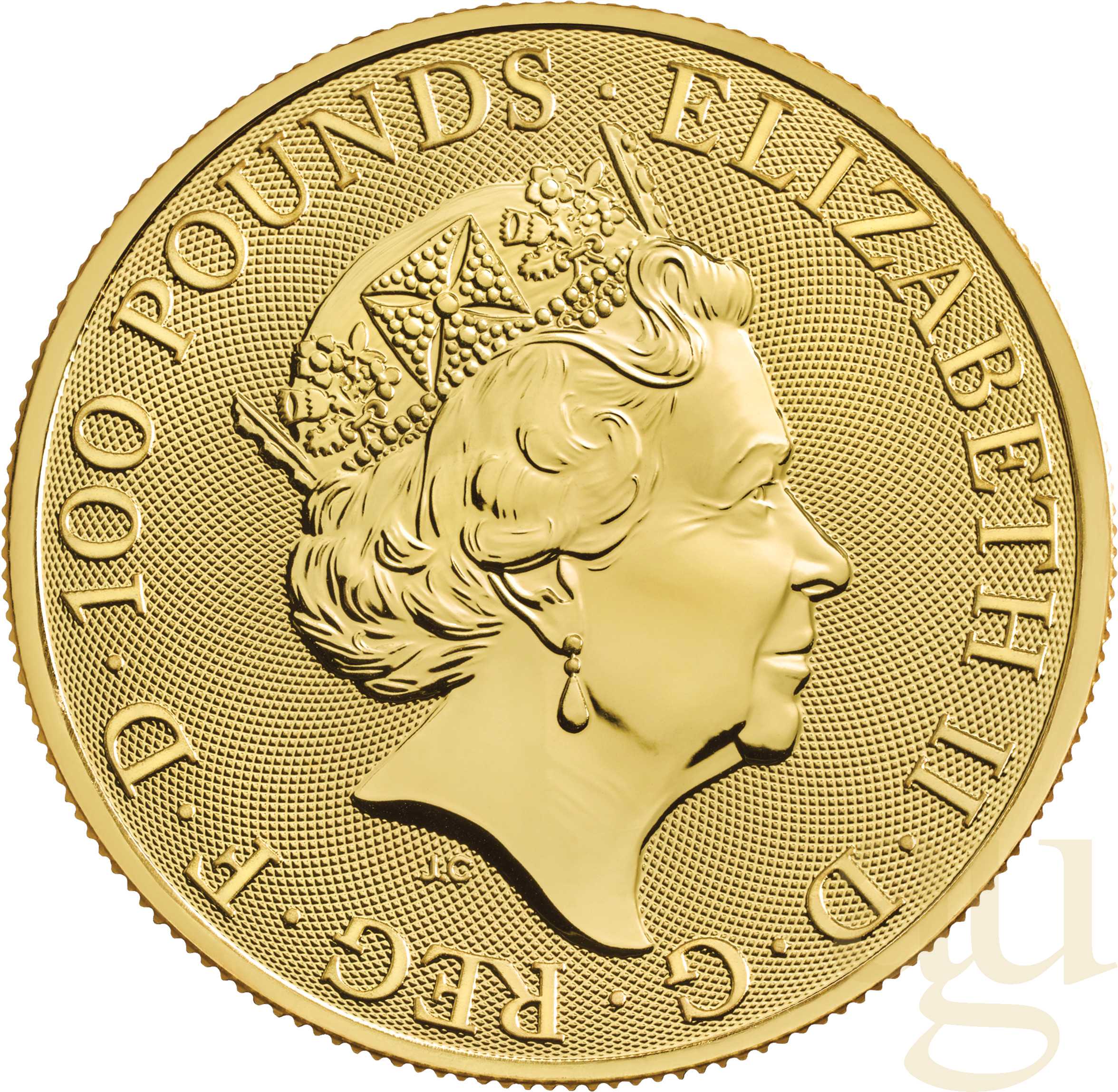 1 Unze Goldmünze Queens Beasts Unicorn 2018 Die Queen Beasts umfasst die folgenden heraldischen Tiere und Fabelwesen: The Lion of England (der Löwe von England), The Griffin of Edward III (der Greif Edwards III), The Falcon of The Plantagenets (der Falke der Plantagenets), The Black Bull of Clarence (schwarzen Stier von Clarence), The Yale of Beaufort (der Yale von Beaufort), The White Lion of Mortimer (der weiße Löwe von Mortimer), The White Greyhound of Richmond (der weiße Windhund von Richmond), The Red Dragon of Wales (der rote Drachen von Wales), The Unicorn of Scotland (das Einhorn von Schottland), The White Horse of Hanover (das weiße Pferd von Hannover) Seit dem Jahr 2016 wird die „The Queen´s Beasts“ Serie von der britischen Royal Mint ausgegeben. Die Serie beinhaltet zehn verschiedene Wappenmotive, die Rückseite wird von Königin Elizabeth ll geziert. Mit einem Nennwert von 100 Pounds gelten die Münzen als anerkanntes Zahlungsmittel in Großbritannien. Die Serie symbolisiert zehn imposante Tierstatuen, welche bei der Krönung von Königin Elizabeth II. im Jahre 1953 den Eingang von Westminster Abbey zierten.