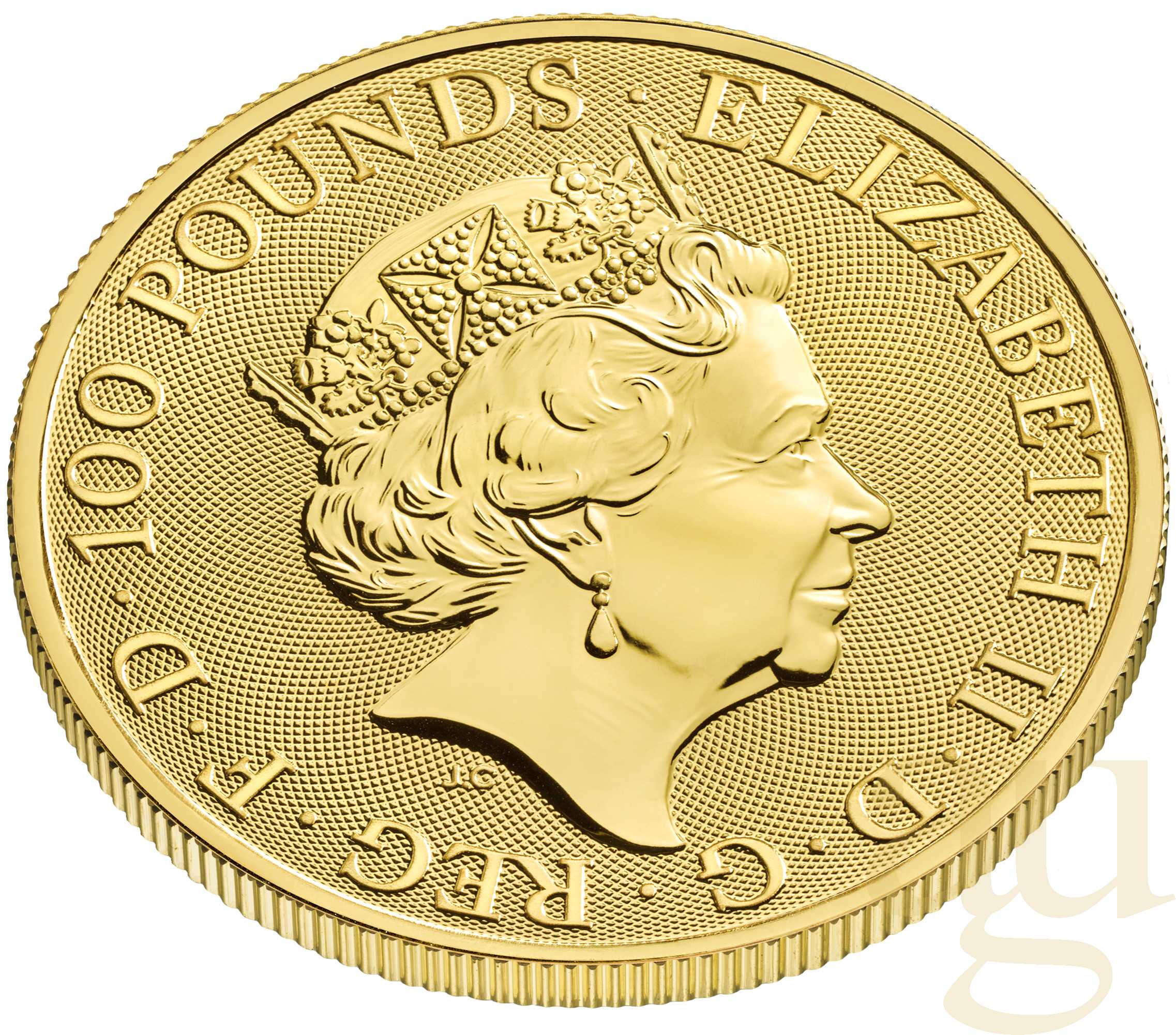 1 Unze Goldmünze Queens Beasts Black Bull 2018 Die Queen Beasts umfasst die folgenden heraldischen Tiere und Fabelwesen: The Lion of England (der Löwe von England), The Griffin of Edward III (der Greif Edwards III), The Falcon of The Plantagenets (der Falke der Plantagenets), The Black Bull of Clarence (schwarzen Stier von Clarence), The Yale of Beaufort (der Yale von Beaufort), The White Lion of Mortimer (der weiße Löwe von Mortimer), The White Greyhound of Richmond (der weiße Windhund von Richmond), The Red Dragon of Wales (der rote Drachen von Wales), The Unicorn of Scotland (das Einhorn von Schottland), The White Horse of Hanover (das weiße Pferd von Hannover) Seit dem Jahr 2016 wird die „The Queen´s Beasts“ Serie von der britischen Royal Mint ausgegeben. Die Serie beinhaltet zehn verschiedene Wappenmotive, die Rückseite wird von Königin Elizabeth ll geziert. Mit einem Nennwert von 100 Pounds gelten die Münzen als anerkanntes Zahlungsmittel in Großbritannien. Die Serie symbolisiert zehn imposante Tierstatuen, welche bei der Krönung von Königin Elizabeth II. im Jahre 1953 den Eingang von Westminster Abbey zierten.