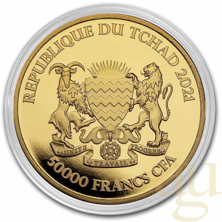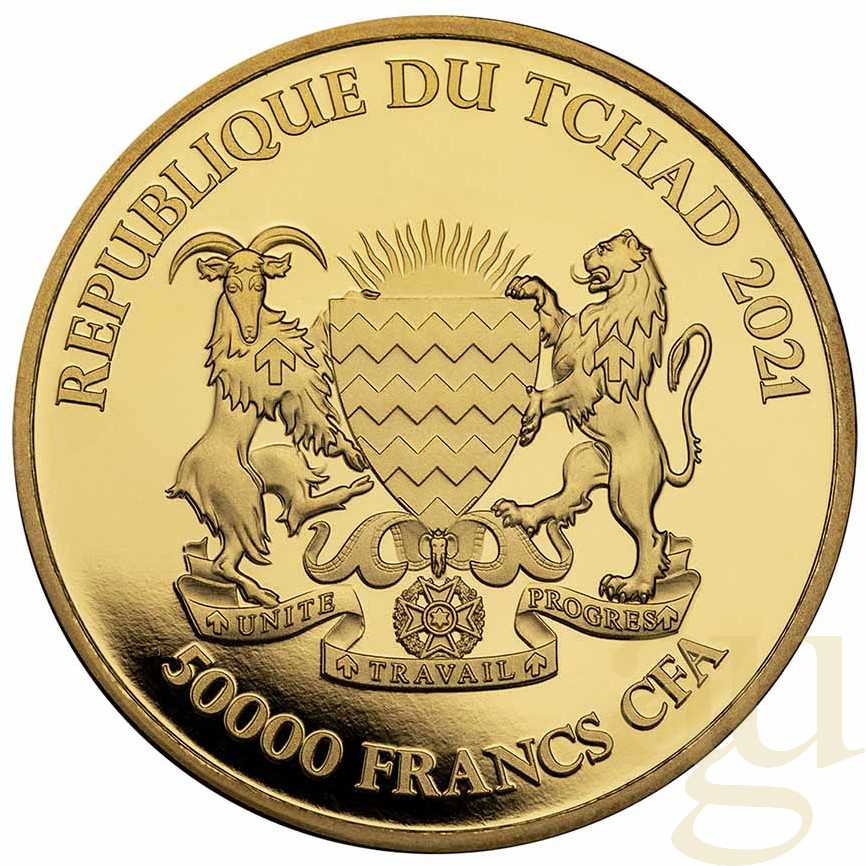 1 Unze Goldmünze Republic of Tschad Mandala Warzenschwein 2021 Die Goldmünze im Mandala Design zeigt auf der Vorderseite das Bild eines Warzenschweins. Die Münzrückseite bildet das Wappen der Republik Tschad, ein Schild getragen von einer Ziege und einem Löwen ab. Der Schriftzug unterhalb des Wappens „Unite, Travail, Progres“ bedeutet übersetzt Einheit, Arbeit und Fortschritt. Die Münze hat ein Gewicht von einer Unze Gold mit einer Feinheit von 999.9 / 1.000, die Limitierung ist auf nur 100 Stücke weltweit angegeben, der Nennwert beträgt 50.000 Francs.