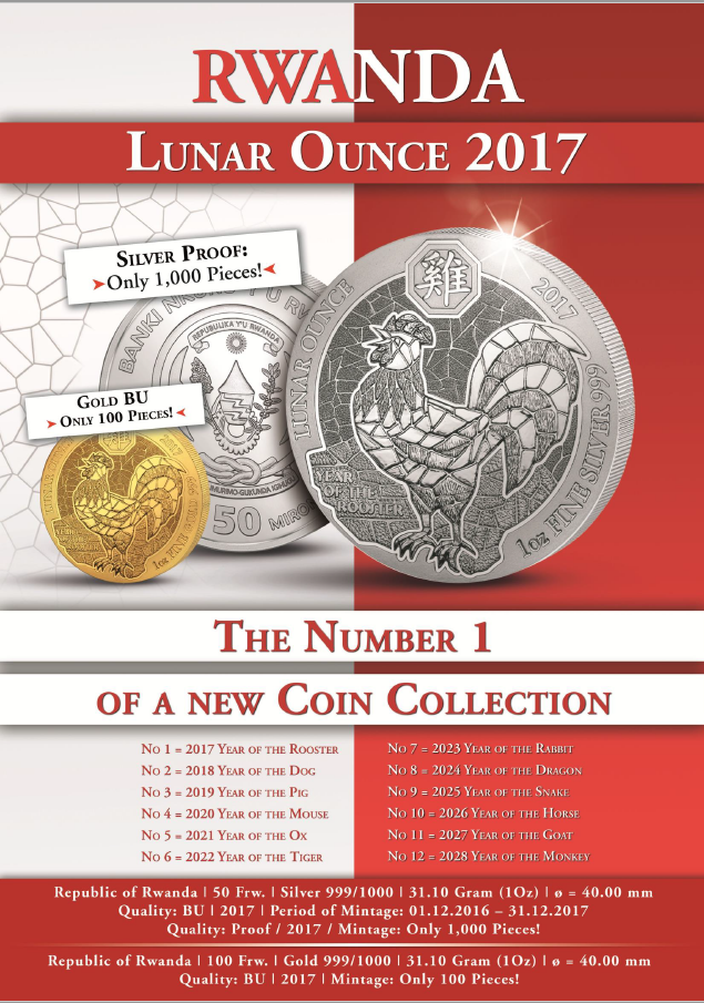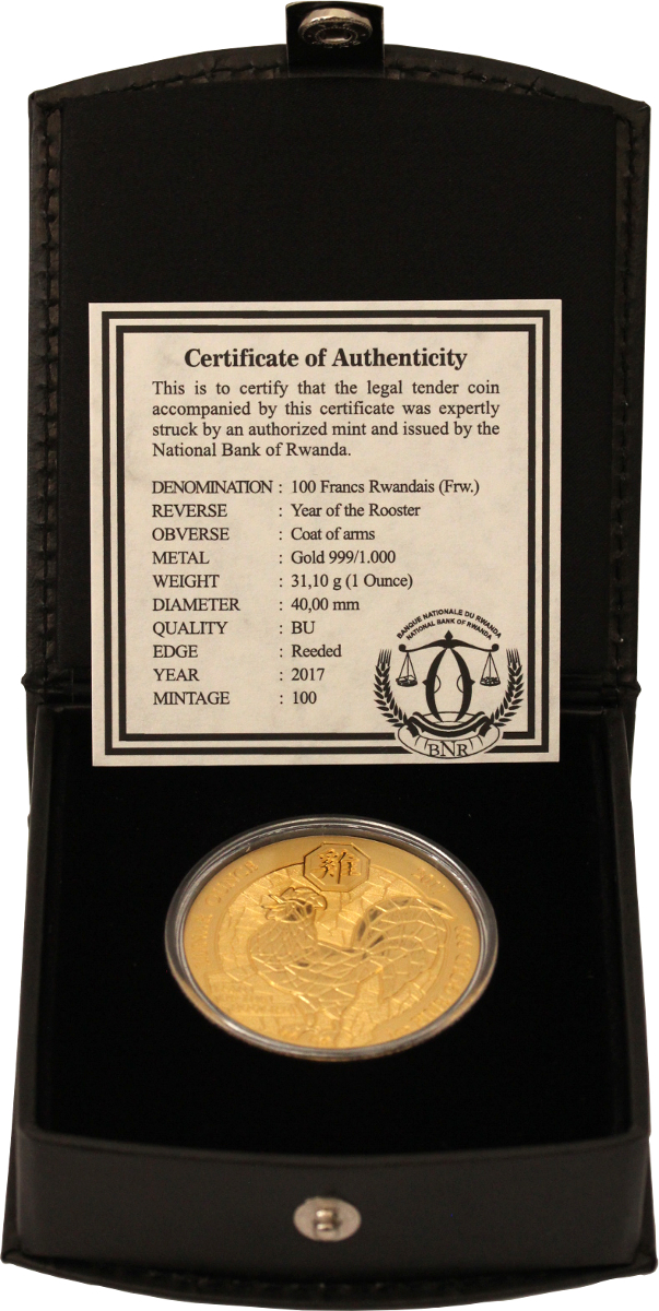 Es handelt sich um die erste Ausgabe der neuen Goldmünze Serie Ruanda Lunar Serie mit einer sehr geringen Auflage von nur 100 Stück weltweit! Im Jahr 2017 startete die neue Lunar Goldmünzserie aus Ruanda mit dem Motiv des Hahns. Die Ruanda Lunar Serie besteht aus 12 Münzen, mit jährlich wechselnden Motiven, die wie alle Lunar Serien an den chinesischen Tierkreiskalender angelehnt sind. Die Vorderseite der Sammlermünze zeigt einen Hahn der wie ein Mosaik dargestellt wurde, durch die glänzenden und matten Polierungen entstand ein extravaganter stolzer Hahn. Weiterhin befindet sich auf der Motivseite das chinesische Zeichen für das Jahr des Hahns. Die Umschrift lautet „LUNAR OUNCE, 2017, 1 OZ FINE GOLD, YEAR OF THE ROOSTER”. Die Rückseite ist mit dem Siegel von Ruanda geprägt. Das Siegel zeigt einen Agaseke-Korb in der Mitte und zwei Schilde als traditionelles afrikanisches Symbol, aber auch ein Zahnrad, eine Sorghum- und eine Kaffeepflanze. Oben in der Mitte die Sonne, welche auch in der Flagge abgebildet ist. Auf einem goldenen Spruchband oben steht der Landesname in Kinyarwanda – Repubulika y'u Rwanda, Republik Ruanda –, auf einem zweiten goldenen Spruchband unten das Motto: „Ubumwe, Umurimo, Gukunda Igihugu“ (Einheit, Arbeit, Patriotismus). Die beiden Schilde stehen für Patriotismus und die Verteidigung der nationalen Souveränität wie auch für Redlichkeit und Gerechtigkeit. Ein grüner Ring, der das Siegel umgibt und in einem Knoten unten endet, symbolisiert die industrielle Entwicklung durch gemeinsame Anstrengungen. Die Schrift auf der Münzrückseite ist in Kinyarwanda verfasst, einer offiziellen Amtssprache in Ruanda. Oberhalb des Siegels ist der Schriftzug "Banki Nkuru Y`u Rwanda" (Nationalbank von Ruanda) abgebildet. Unterhalb befindet sich die Angabe des Nennwertes von „100 FRANCS“. Diese wunderschöne Goldmünze wird lediglich in einer extrem geringen Auflage von 100 Stück herausgegeben.