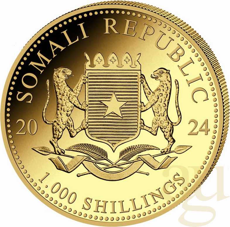 Auf der Wertseite der malerischen Münze sehen Sie mittig das Staatswappen Somalias mit seinen zwei Leoparden passend zum Motiv, umrandet von “1.000 SCHILLING”, “SOMALI REPUBLIC” und “2024”