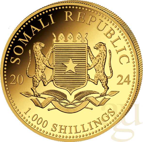 - Rückseite: Auf der Rückseite ist das Wappen von Somalia, das Prägejahr 2024 und der Nennwert abgebildet.