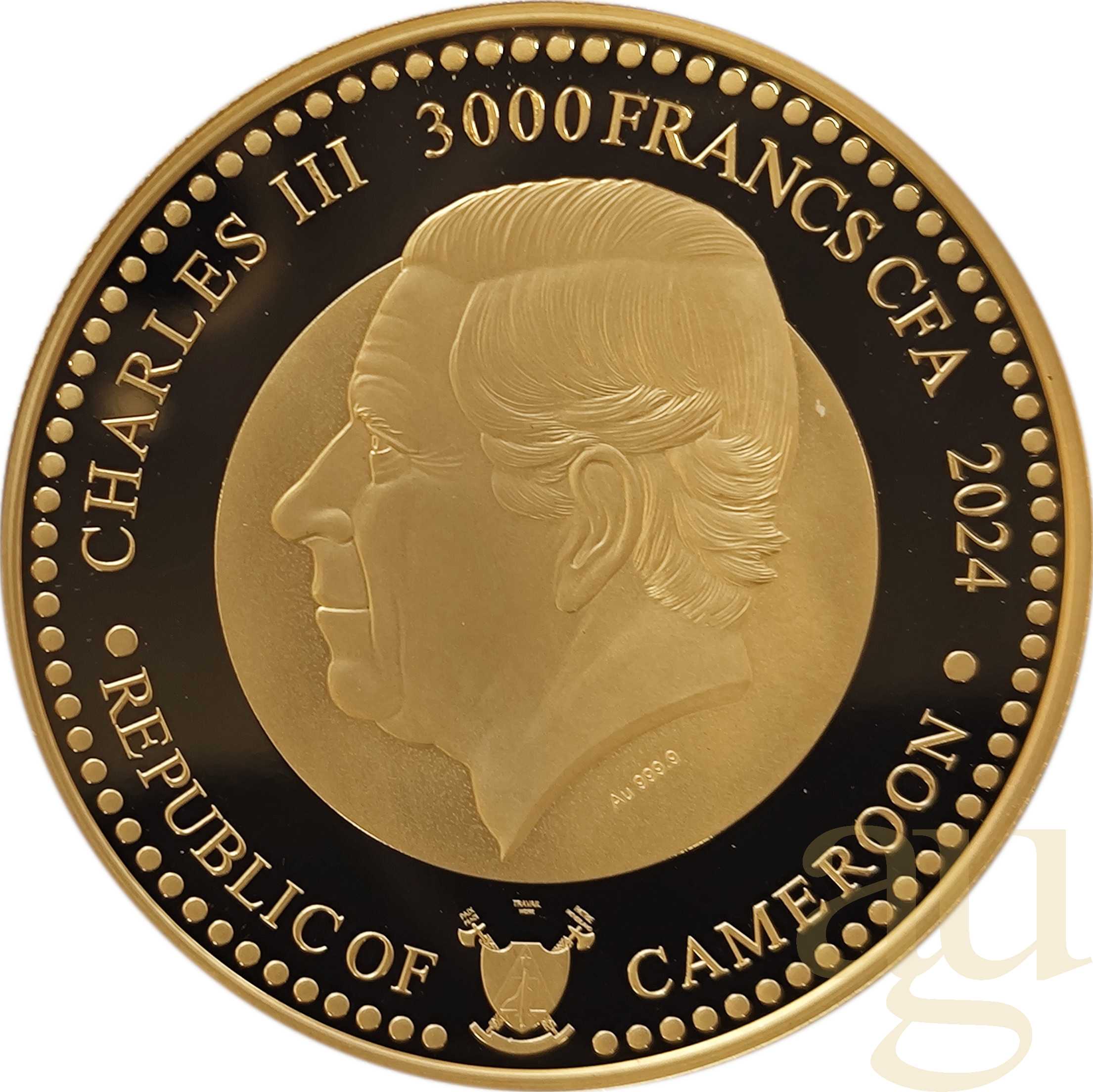 Die 1 Unze schwere Goldmünze zeigt im Zentrum der Motivseite den wunderschönen Australian Shepherd in seiner vollen Pracht. Der elegante Schriftzug "USA" und die Szenerie die sich im Hintergund abspielt weißen auf das nordamerikanische Herkunftsland hin. Auf der Umrandung ist neben dem lupenreinen Feinheitsgrad die Beschriftung der Serie "World Famous Dogs" mit Pfote und "Australian Shepherd" zu sehen. Die Wertseite zeigt zentral erstmals, statt der Queen, den neuen Amtsinhaber King Charles III und auf der Umrandung den Nennwert von 3000 CFA-Francs sowie die Zugehörigkeit zu Kamerun mit dem Staatswappen.