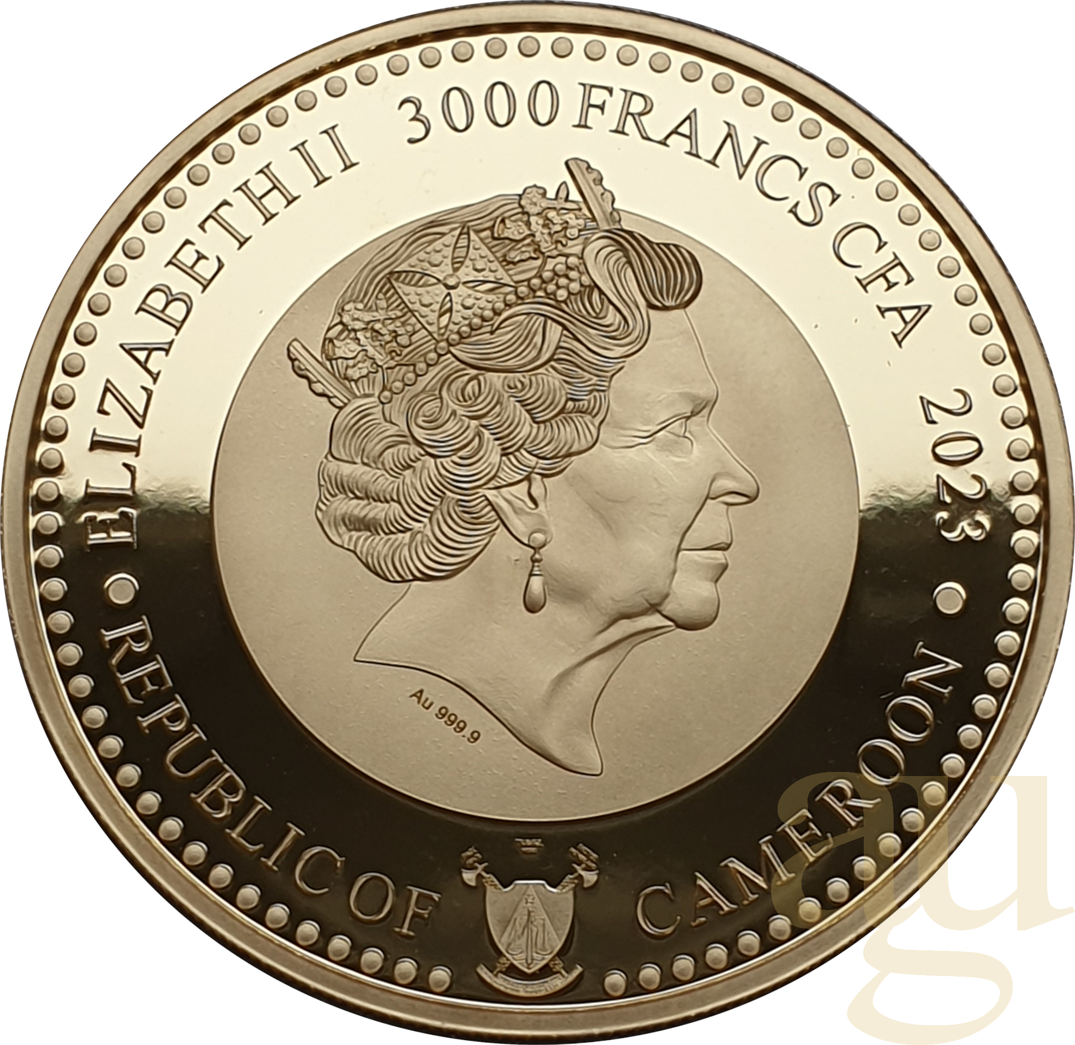 Die 1 Unze schwere Goldmünze zeigt im Zentrum der Motivseite einen kleinen putzigen Chihuahua der gemütlich auf dem Bauch liegt. Der elegante Schriftzug "Mexico" und die dazu passende Szenerie die sich im Hintergund abspielt weißen auf dieses Herkunftsland hin. Auf der Umrandung ist neben dem lupenreinen Feinheitsgrad die Beschriftung der Serie "World Famous Dogs" mit Pfote und "Chihuahua" zu sehen. Die Wertseite zeigt zentral Queen Elizabeth II und auf der Umrandung den Nennwert von 3000 CFA-Francs sowie die Zugehörigkeit zu Kamerun mit dem Staatswappen.