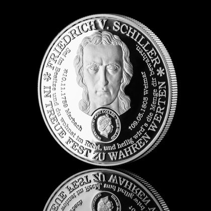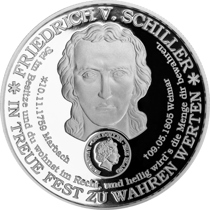 Projekt & Namensgebung: Die deutsche Bürgermünze Germania ist die erste und einzige ihrer Art. Sie ist zugleich eine nationale sowie auch internationale Anlagemünze in Silber. Die Figur der Germania ist die allegorische Verkörperung Deutschlands und wurde bereits in der römischen Kaiserzeit auf den Münzen des Domitians mit der Legende Germania capta („gefangene Germania“) dargestellt. Ihr Leitspruch lautet: Souverän ist, wer frei ist. Nennwert: Für die Ausgabe 2013 beträgt der Nennwert der Bürgermünze Germania 1 Dollar Neuseeland und ist eine Agenturausgabe von Niue Island, welches von der Münze Neuseeland verwaltet wird. Im Wertstempel befindet sich das Portrait der Königin Elisabeth II., Monarchin des Hauses Windsor. König Georg der V. von England änderte am 17. Juli 1917 den deutschen Namen des Königshauses von Sachsen-Coburg-Gotha in den jetzigen Namen Windsor. Illustratoren: Die Germania der Bürgermünze wurde von Thomas Vömel (Vönix) illustriert. Schiller‘s Kopf auf der Rückseite wurde von Herrn Pfante aus Weimar graphisch umgesetzt. Erstausgabe: 18. Oktober 2013 zum Doppeljubiläum 200 Jahre Völkerschlacht und 100 Jahre Völkerschlachtdenkmal.
