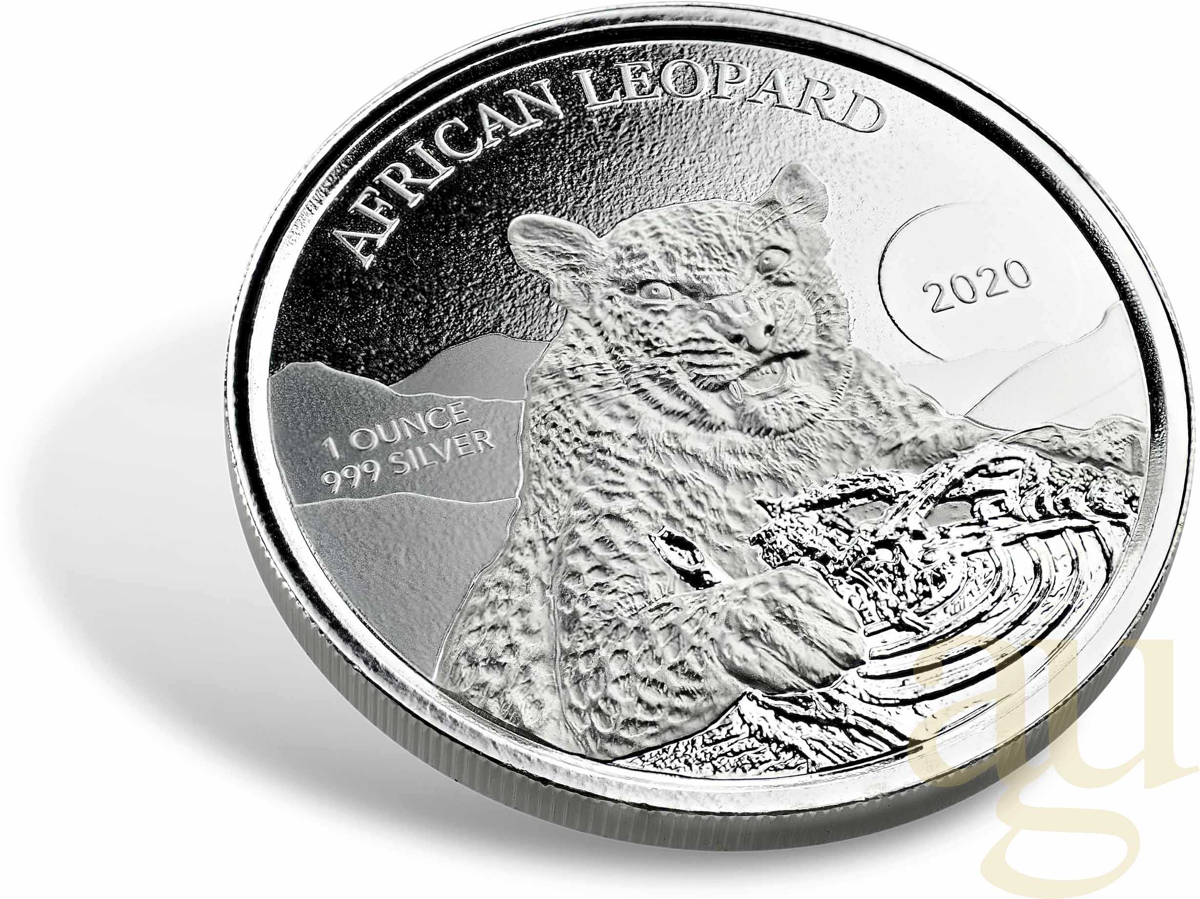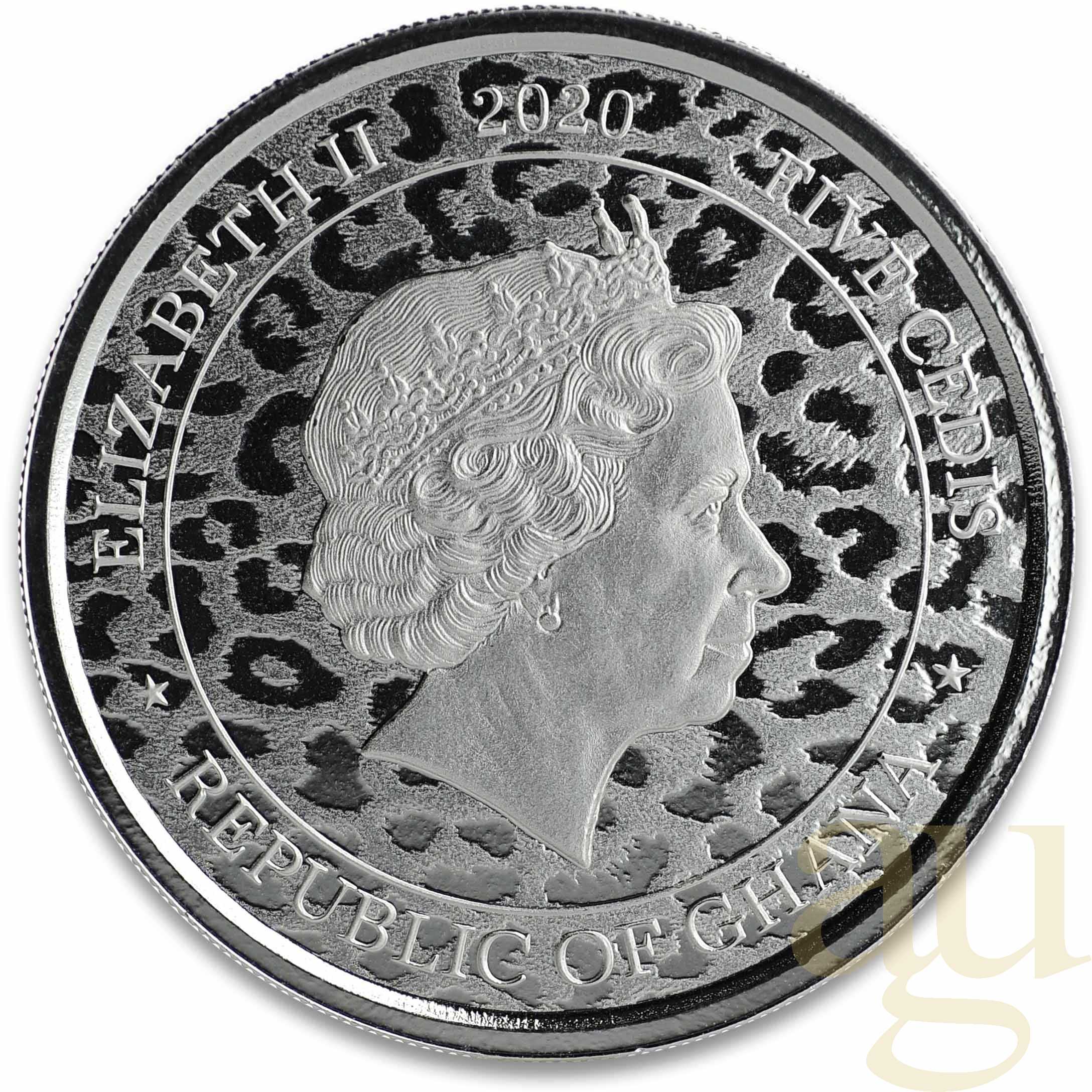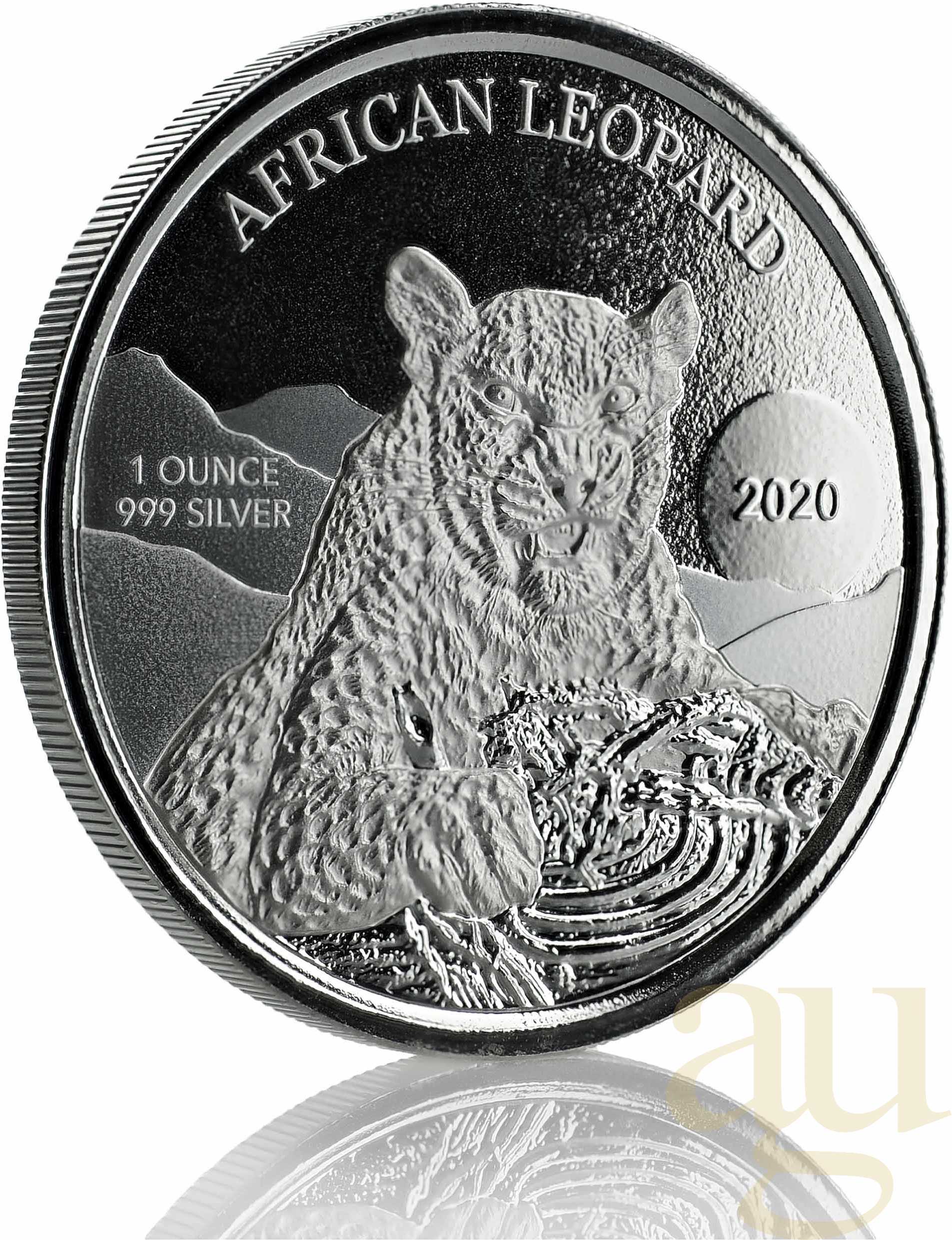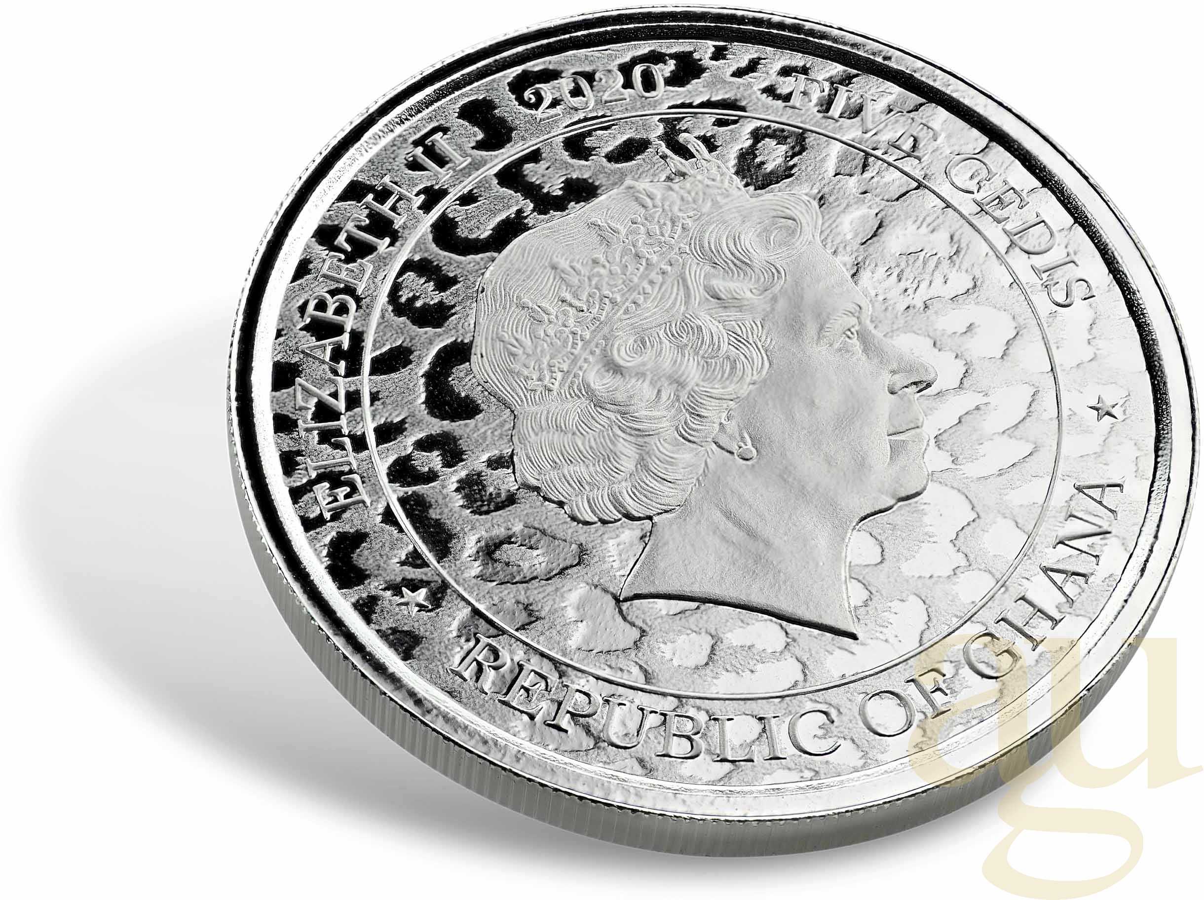 Die so genannte Agenturausgabe African Leopard Silbermünze wird von der Scottsdate Mint in Arizona (USA) hergestellt. In diesem Fall ist Ghana das Ausgabeland. Somit ist auch der Nennwert mit 5 Credis (offizielle Währung Ghanas) angegeben.