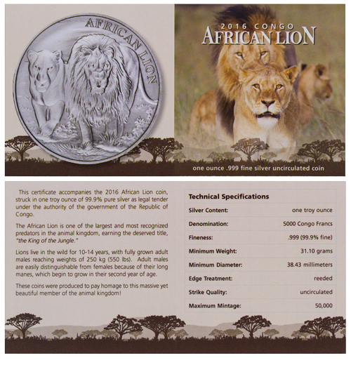 Produktinformationen "1 Unze Silbermünze Afrika Kongo Löwe 2016"