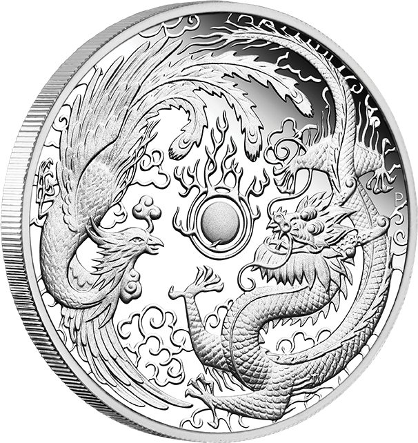 Die Rückseite der Münze zeigt detaillierte Darstellungen eines Drachen und eines Phönix mittig einer flammenden Kugel, mit einer stilisierten Darstellung von Wolken im Hintergrund. Das Design beinhaltet das Münzzeichen "P" der Perth Mint.