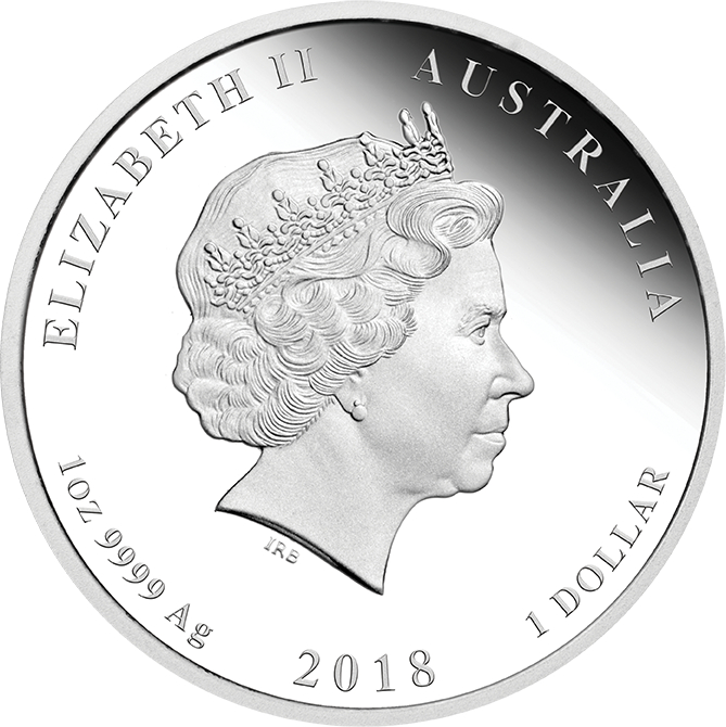 Auf der Vorderseite ist das Portrait von Elisabeth II., designt von Ian Rank-Broadley, zu sehen sowie die Umschrift „ELIZABETH II", „AUSTRALIA", „1 oz 9999 AG", der Jahrgang „2018“ und der Nennwert von „1 DOLLAR".