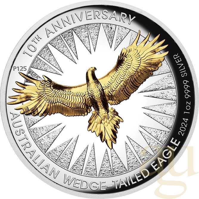 Produktinformationen "1 Unze Silbermünze Australien Wedge Tailed Eagle 10th Anniversary 2024 High Relief - teilvergoldet"
