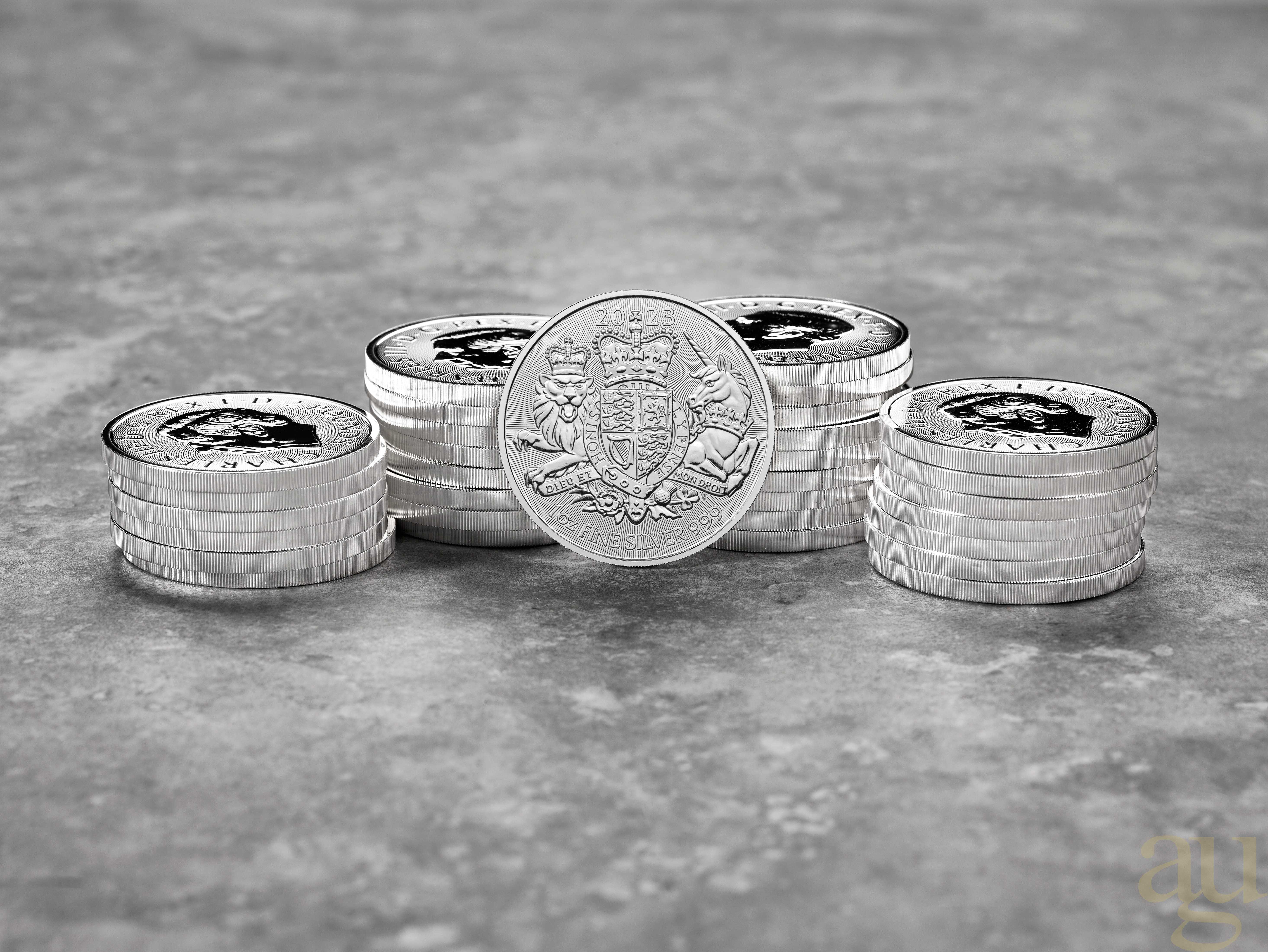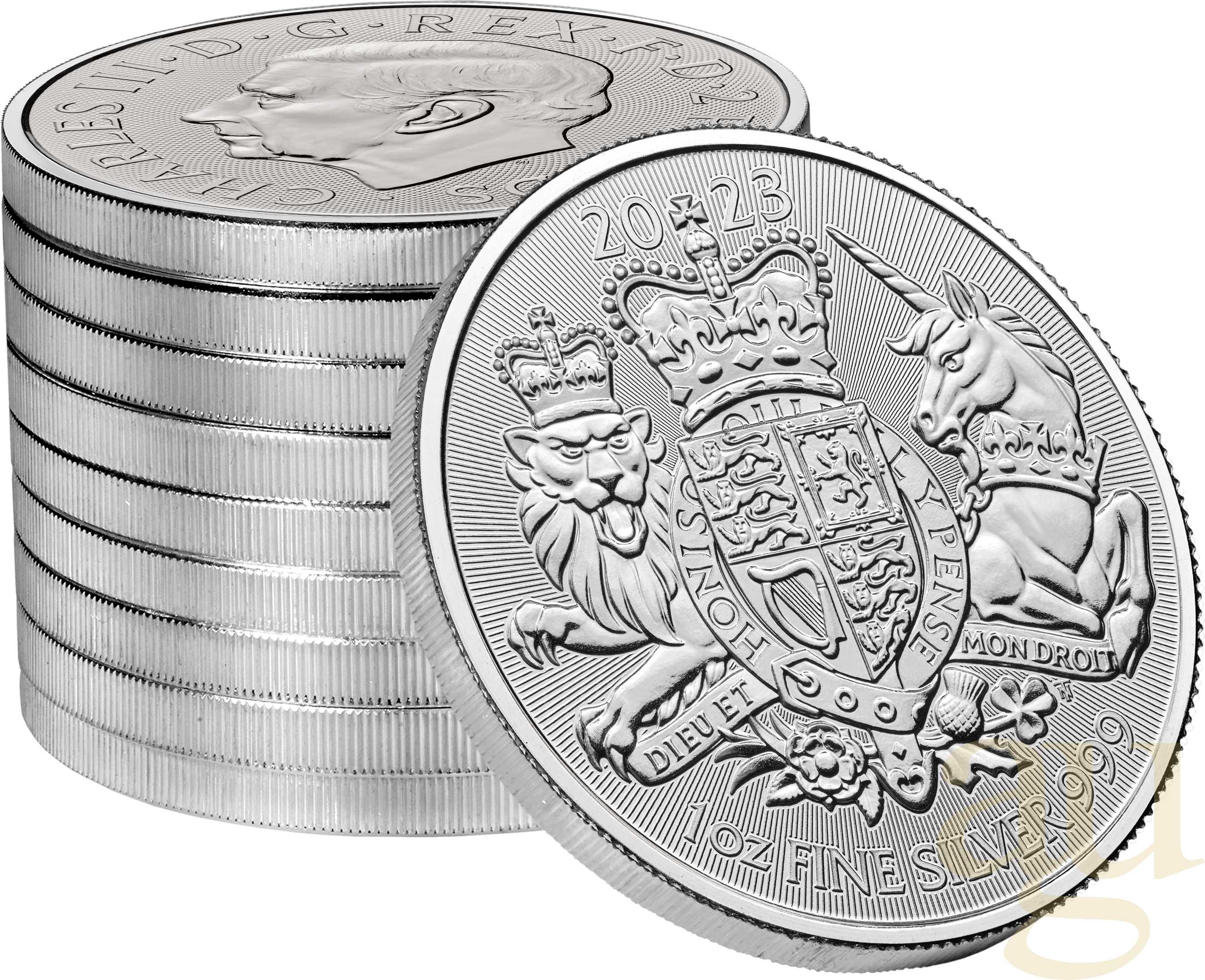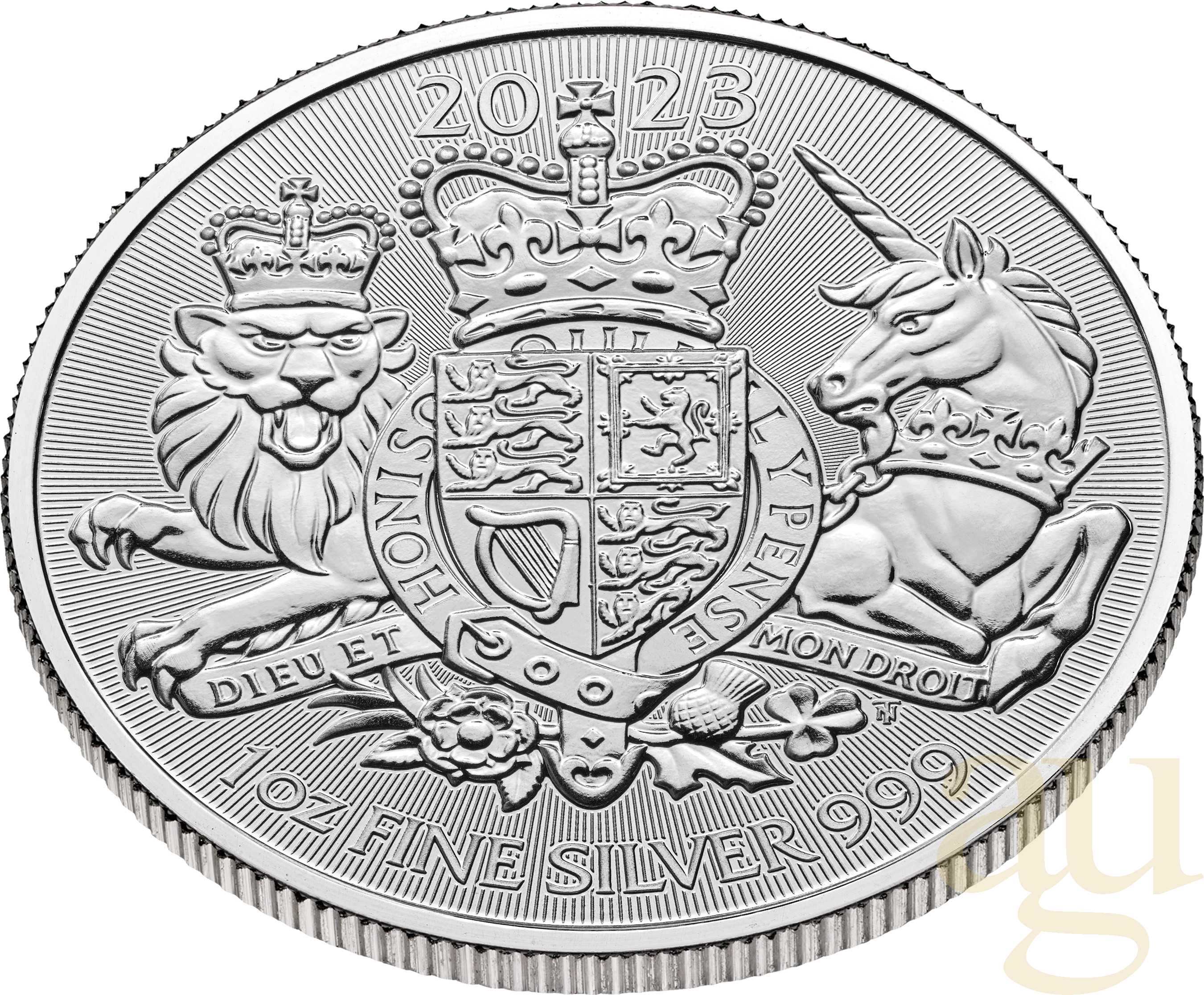Die neuste Bullion Münze "Großbritannien Royal Arms 2023" der Royal Mint wird dem Wappen Großbritanniens gewidmet, welches auch im Vordergrund der Münze steht. Es wurde von Eric Sewell entworfen und lässt sich in vier Bereiche unterteilen. Jeder Bereich repräsentiert dabei einen Teil des Königreichs. Im ersten und vierten Quadranten befinden sich jeweils die drei Löwen, die für England stehen. Im zweiten Quadranten ist das Scottische Wappenlogo zu sehen, ein einzelner Löwe. Der dritte Quadrant beinhaltet als Symbol für Irland, eine Harfe.