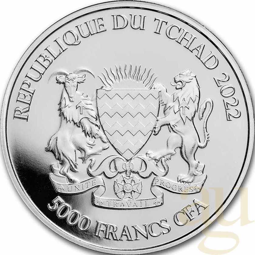Die Silbermünze zu 1oz Feinsilber zeigt auf der Vorderseite ein afrikanisches Krokodil umgeben vom Schriftzug 5.000 Franc CFA. Die Rückseite zeigt das Wappen der Republik Tchad und den Schriftzug 5.000 Francs CFA sowie die Jahreszahl 2023. Die Auflage ist gering mit nur 10.000 Stück weltweit angebotenen Münzen.