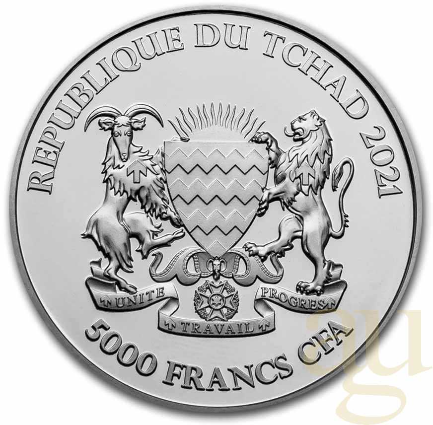Die Silbermünze zu 1oz Feinsilber zeigt auf der Vorderseite ein afrikanisches Warzenschwein umgeben vom Schriftzug 5.000 Franc CFA. Die Rückseite zeigt das Wappen der Republik Tchad und den Schriftzug 5.000 Francs CFA sowie die Jahreszahl 2021. Die Auflage ist gering mit nur 10.000 Stück weltweit angebotenen Münzen.