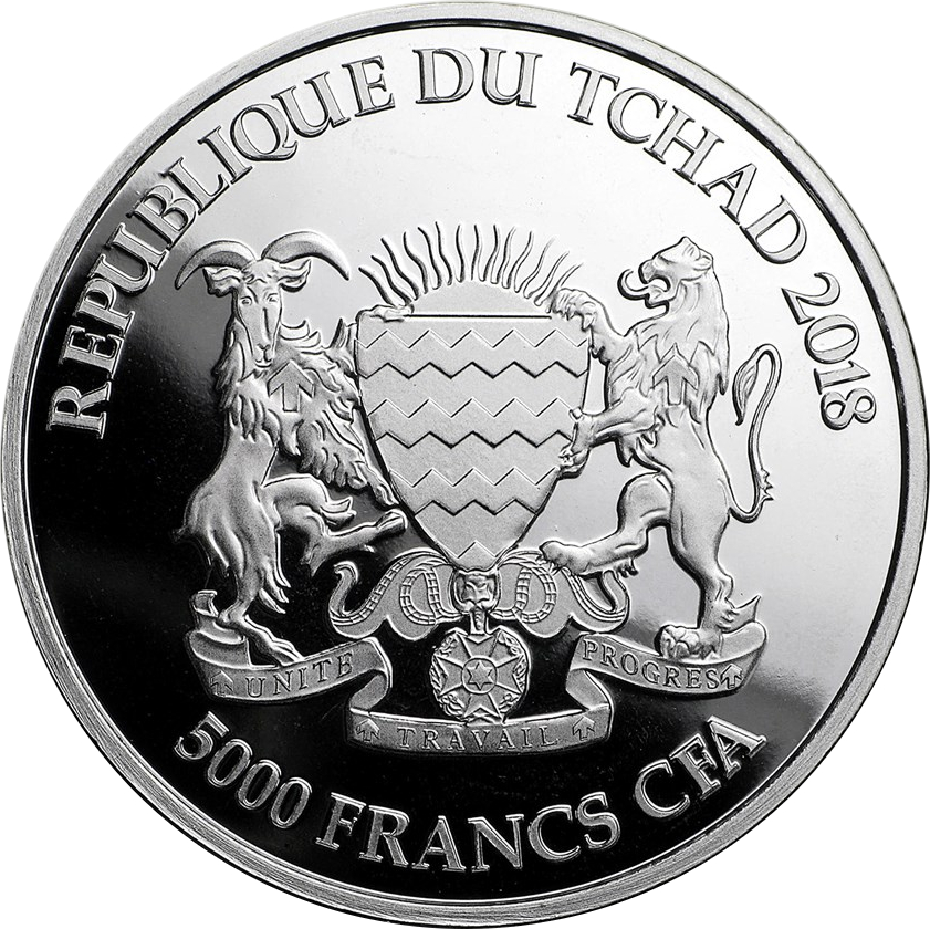 Die Silbermünze zu 1oz Feinsilber zeigt auf der Vorderseite einen afrikanischen Löwen umgeben vom Schriftzug 5.000 Franc CFA. Die Rückseite zeigt das Wappen der Republik Tchad und den Schriftzug 5.000 Francs CFA sowie die Jahreszahl 2018.