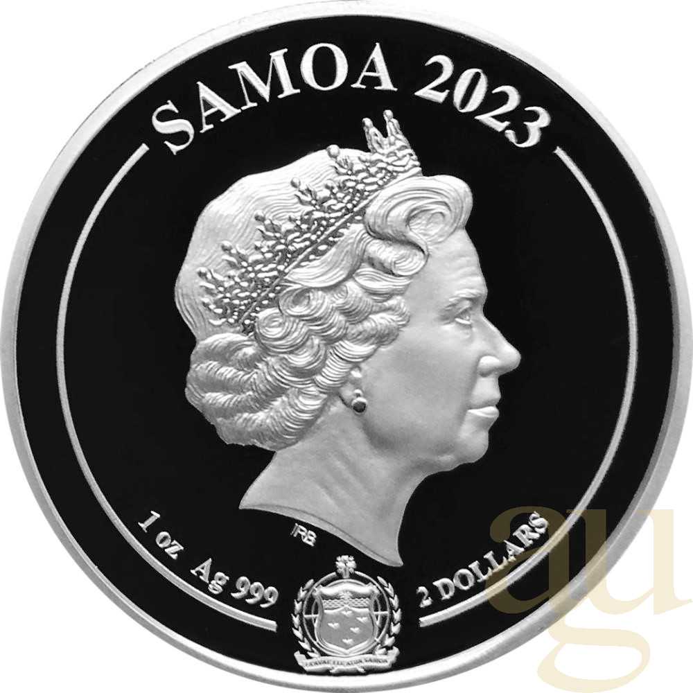 Die 1 Unze Silbermünze Samoa Golden Eagle 2023 beeindruckt mit einer limitierten Auflage von 10.000 Stück. Mit einem Nennwert von 2 Dollar zeigt sie auf ihrer Motivseite das majestätische Bild des goldenen Adlers, der Weite und Unabhängigkeit symbolisiert. Auf der Wertseite der Münze ist das bekannte Prägemotiv der 2022 verstorbenen englischen Queen Elizabeth II abgebildet sowie der Schriftzug Samoa, welcher auf den Herkunftsstaat der Münze verweist. Jede Silbermünze wird in einer Münzkapsel geliefert, um die optimale Erhaltung und ihren Wert zu sichern.