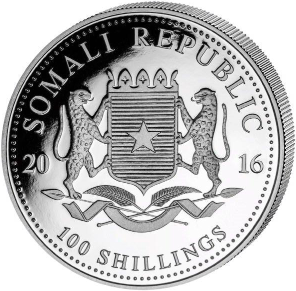 Die 1 Unze Silbermünze Somalia Elefant 2016 ist Teil der Serie African Wildlife. Jährlich wechseln die Motive von Elefanten auf der Bildseite der Münzen. Auf der Wertseite der Münze ist das somalische Wappen, die Umschrift „Somali Republic“ sowie das Prägejahr und der Nennwert zu sehen.