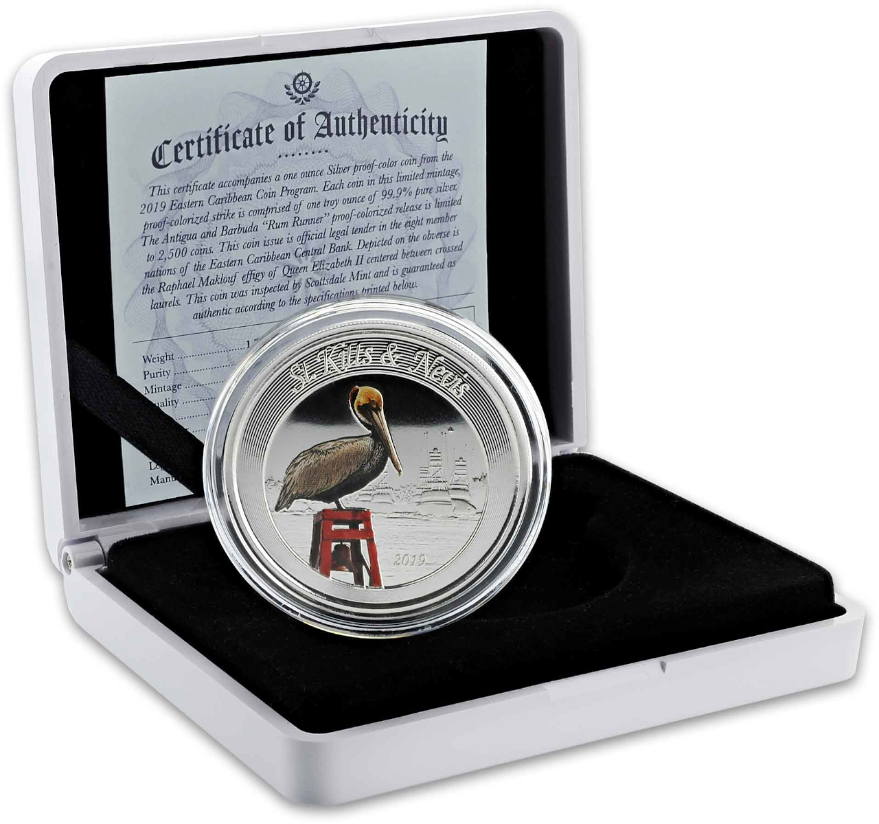 Diese wunderschöne 1 Unze Silbermünze EC8 St. Kitts & Nevis - Pelikan 2019 - coloriert (Blister, Zertifikat) aus dem Jahr 2019 besitzt einen Edelmetallanteil von 99,9% FeinSilber, sowie ein Feingewicht von 31,10g und wird mit einer Stückelung von 1 Unze in einer Blister mit Zertifikat ausgeliefert. Die Silbermünzen besitzen einen Nominalwert von 2 XCD (Ostkaribische Dollar).