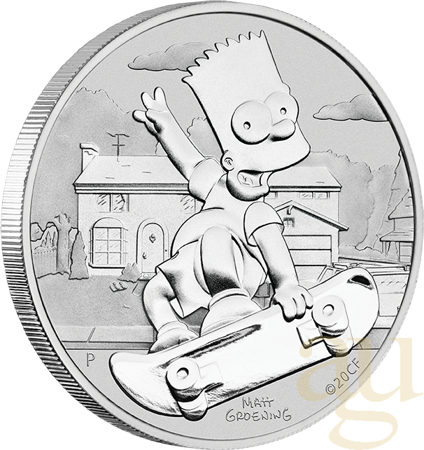 Sind Sie schneller als Bart auf seinem Skateboard? Ergattern Sie jetzt die 1 Unze Silbermünze mit dem Skateboardfahrer Bart aus der kultigen Simpson Serie und erleben Sie die verrückte Welt von Springfield. Aber beeilen Sie sich, bevor Homer alle Donuts aufisst!