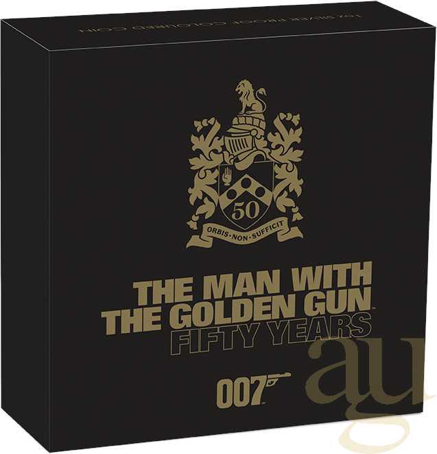 Auf der Vorderseite präsentiert die Münze eine farbige Darstellung von James Bond und Francisco Scaramanga, die sich in einem epischen Pistolenduell gegenüberstehen. Im Hintergrund sind Bilder des Meeres und der Inseln zu sehen, umrahmt von Spiralformen des ikonischen 007-Revolver-Logos. Die Inschrift "THE MAN WITH THE GOLDEN GUN FIFTY YEARS" unterstreicht das bedeutende Jubiläum.