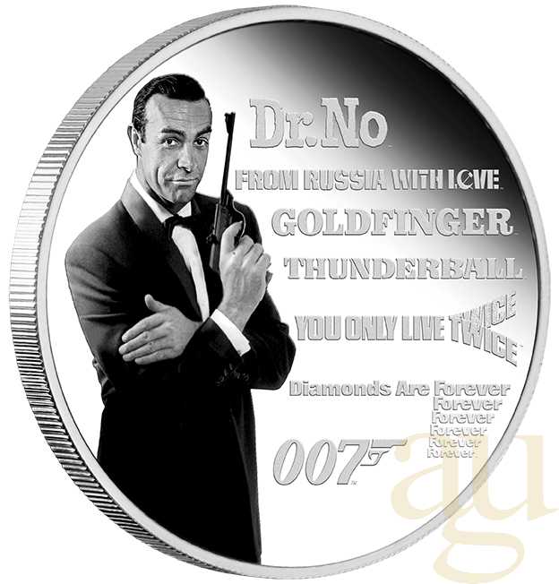 Die Rückseite der Münze zeigt ein Schwarz-Weiß-Bild des beliebten Schauspielers in einer klassischen Bond-Pose. Das Design zeigt die ikonische 007-Pistole inmitten der Inschriften von Connerys triumphalen Bond-Filmen, die zwischen 1962 und 1971 erschienen - Dr. No, Goldfinger, From Russia With Love, Thunderball, You Only Live Twice und Diamonds Are Forever.