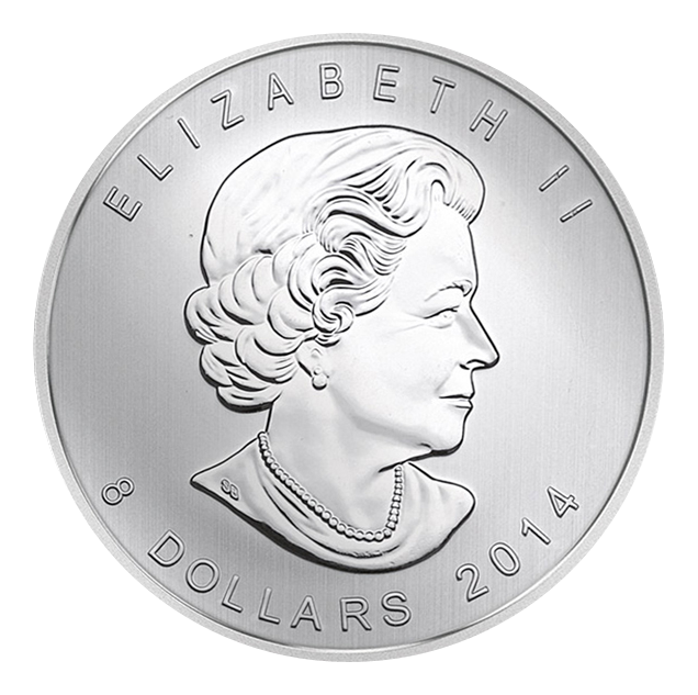 1.5 Unzen Silbermünze Kanada Polarbär 2013 Mit der ungewöhnlichen Größe von 1,5 Unzen ist der seit dem Herbst 2012 präsentierte "Polar Bear" die erste Silberanlagemünze dieser Art der Royal Canadian Mint. Beschreibung der Silbermünze Die Bildseite zeigt den durch die Schneelandschaft wandernden Polarbär. Das Motiv entwarf Germaine Arnaktauyok, die Initialen "GA" findet man unterhalb des hinteren Beines des Bären. Das Tiermotiv ist von einem Ring umgeben, welcher im oberen bereich das Ausgabeland "Canada" und im unteren Teil das Feingewicht von 1,5 Unzen (Fine Silver 1 1/2 OZ Argent Pur) aufweist.  Aufgrund der Zweisprachigkeit ist die Angabe Silber in Englisch und Französisch zu finden. Unterhalb des Polarbären ist die Feinheit von 999.9 ergänzt. Die Münzrückseite zeigt die englische Königin Elizabeth II. In Rundschrift um das Kopfmotiv sind neben dem Namen der Queen (obenstehend - Elizabeth II) auch der Nennwert von acht kanadischen Dollars sowie das Prägejahr 2013 untenstehend abgebildet. Der Münzrand ist geriffelt.