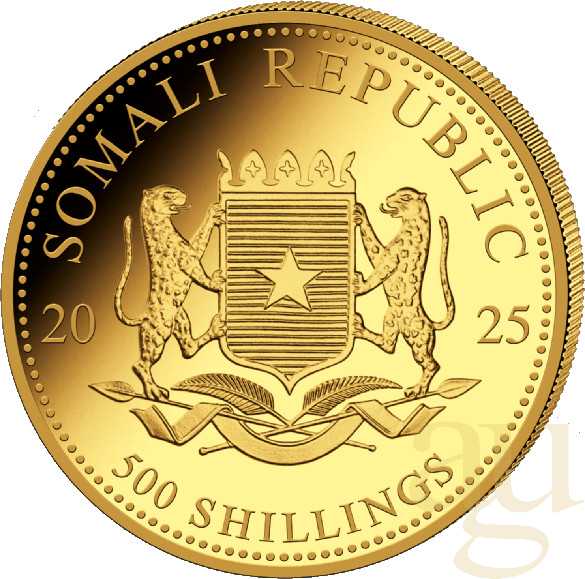 1/4 Unze Goldmünze Somalia Elefant 2025 Seit 2004 wird die Anlagemünze African Wildlife Somalia Elefant beim Bayrischen Münzamt in Deutschland geprägt. Mit Genehmigung der Republik Somalia wird sie von Emporium Hamburg in Auftrag gegeben. Die Goldmünze hat eine Feinheit von 999/1000 und wird in der Währung Somalische Shilling ausgegeben. Der Somalia Elefant ist ein gesetzlich zugelassenes Zahlungsmittel in der Republik Somalia.  Beschreibung der Goldmünze Namensgebend für die Münze ist der afrikanische Elefant, der auf der Vorderseite der Münze abgebildet ist. Das Motiv wechselt jedes Jahr, wodurch der Somalia Elefant zu einer beliebten Anlage- und Sammlermünze geworden ist. Auf der Rückseite sieht man das Staatswappen der Somalischen Republik, das Prägejahr, sowie den Nennwert der Münze. Die Anlagemünzen sind allgemein anerkannt, einfach zu kaufen, zu verkaufen, zu transportieren und zu lagern. Ältere Jahrgänge sind meist gegen einen erhöhten Aufschlag zu erwerben. Damit ist der Somalia Elefant die ideale Ergänzung für Ihre Kapitalanlage.