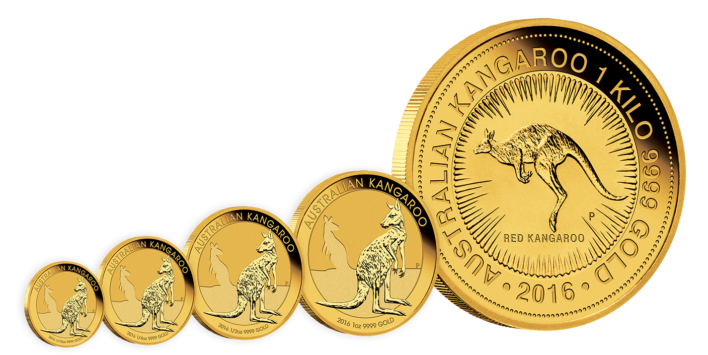 Die „Gold-Kangaroo“ Anlagemünze oder zu deutsch: Känguru, stammt aus der traditionsreichen Perth Mint, alleiniger Hersteller aller Gold- und Silber- Anlagemünzen, die offiziell von der Regierung Australiens in Auftrag gegeben werden. Erstmals prägte 1986 die Perth Mint den „Australien-Nugget“. Das Motiv des ersten Jahrgangs wurde mit dem berühmten „Welcome-Strainger-Nugget“ (Willkommener Fremdling) geprägt. Die weiteren bis 1990 geprägten Münzen mit außergewöhnlichen, in Australien gefundenen, Naturgoldnuggets. Nach vier Jahren des Nugget-Motivs, wurde es 1990 durch die Beibehaltung des Namens, mit dem Nationalsymbol Australiens, dem „Känguru“ ersetzt. Im Gegensatz zu den Goldnuggets, die nicht sehr ansprechend für Anleger waren, stieg der Absatz durch das Tiermotiv „Kangaroo“ rapide an. So prägte die Perth Mint das Känguru in jährlich wechselden Darstellungen. Im Jahr 2008 änderte man den Namen des Känguru-Nugget zum passenderen „Australian-Kangaroo“. Aktuell wird wird das goldene Känguru in folgenden Größen geprägt: 1kg, 1oz, 1/2oz, 1/4oz, 1/10oz. Jede Münze ist einzeln in einer Kapsel verpackt. Zusätzlich werden bis zur Größe von einer Unze (31,1g) immer 20 Stück in Folie zusammen verschweißt.