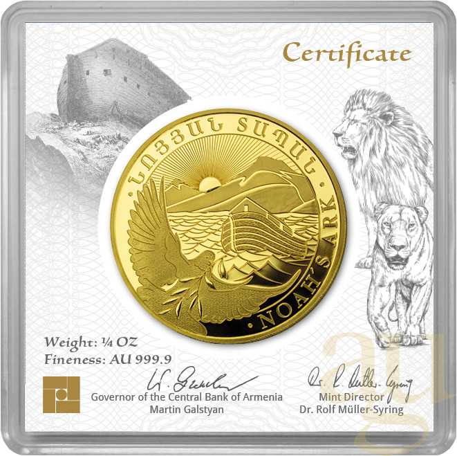 Im September 2020 erschien die Goldmünze Arche Noah aus Armenien erstmals als Anlagemünze in Stempelglanz. Die Geiger Edelmetalle AG besitzt das Prägerecht und produziert die Münze in Deutschland. Auf der Vorderseite ist das aus der Bibel bekannte Schiff in aufgewühlter See vor im Hintergrund verlaufenden Sonnenstrahlen über dem armenischen Gebirge Ararat zu sehen.