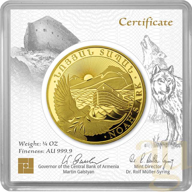 Im September 2020 erschien die Goldmünze Arche Noah aus Armenien erstmals als Anlagemünze in Stempelglanz. Die Geiger Edelmetalle AG besitzt das Prägerecht und produziert die Münze in Deutschland. Auf der Vorderseite ist das aus der Bibel bekannte Schiff in aufgewühlter See vor im Hintergrund verlaufenden Sonnenstrahlen über dem armenischen Gebirge Ararat zu sehen.